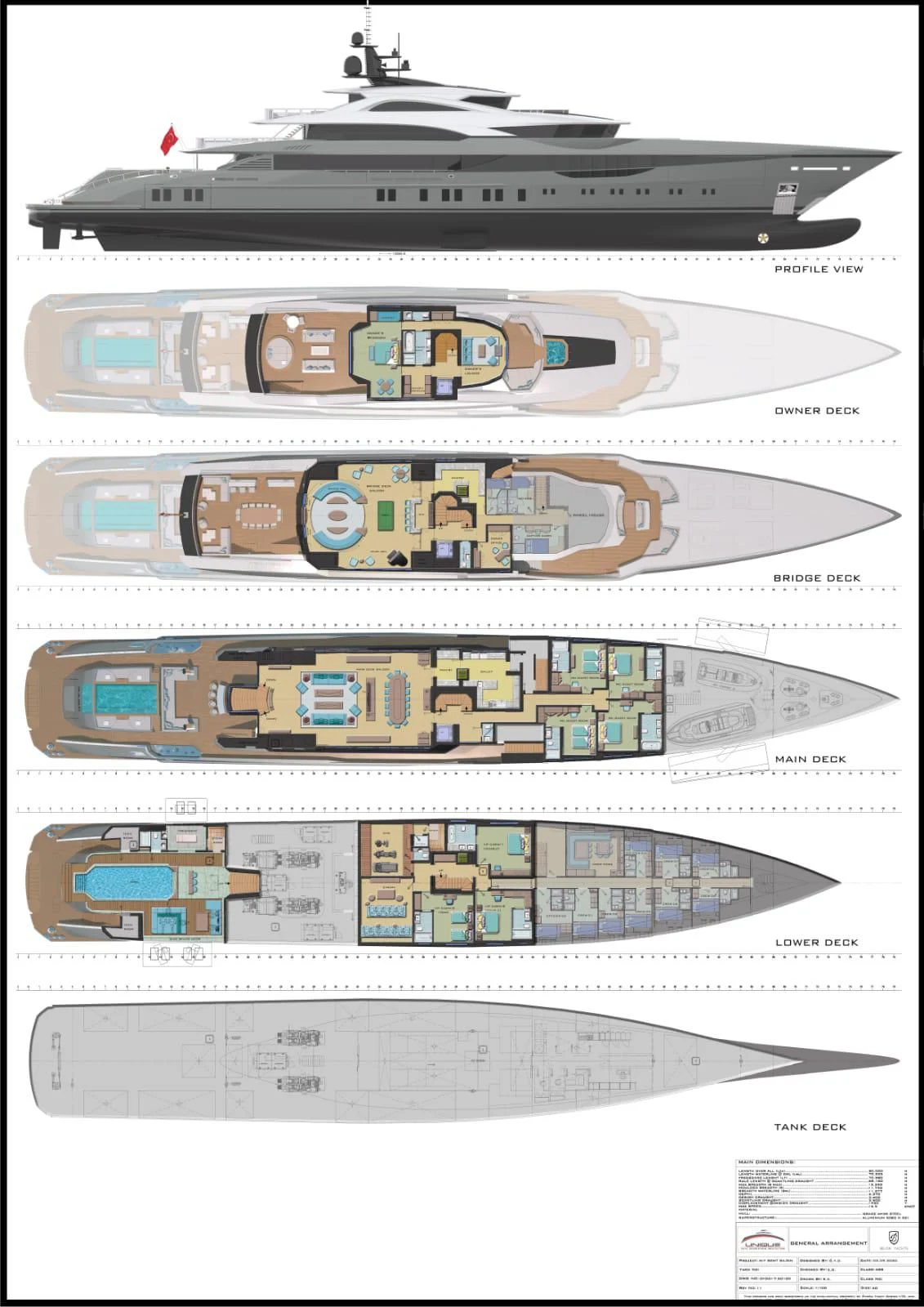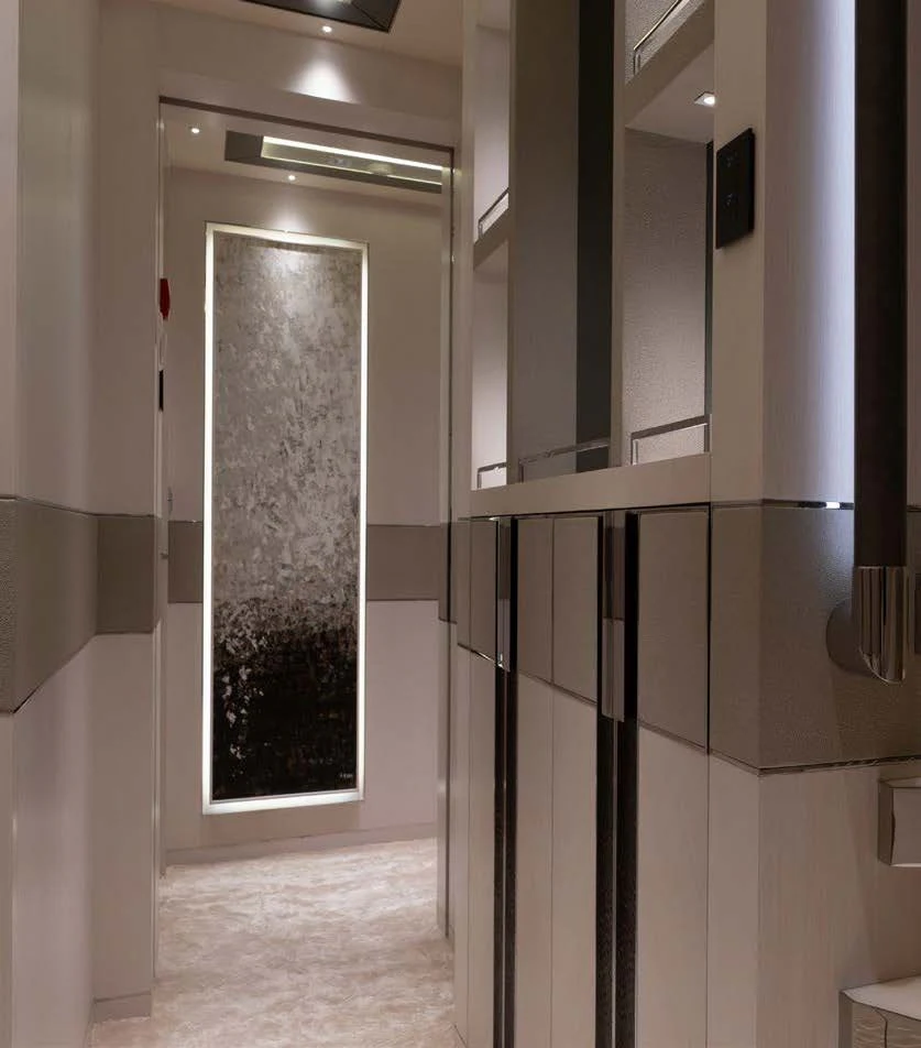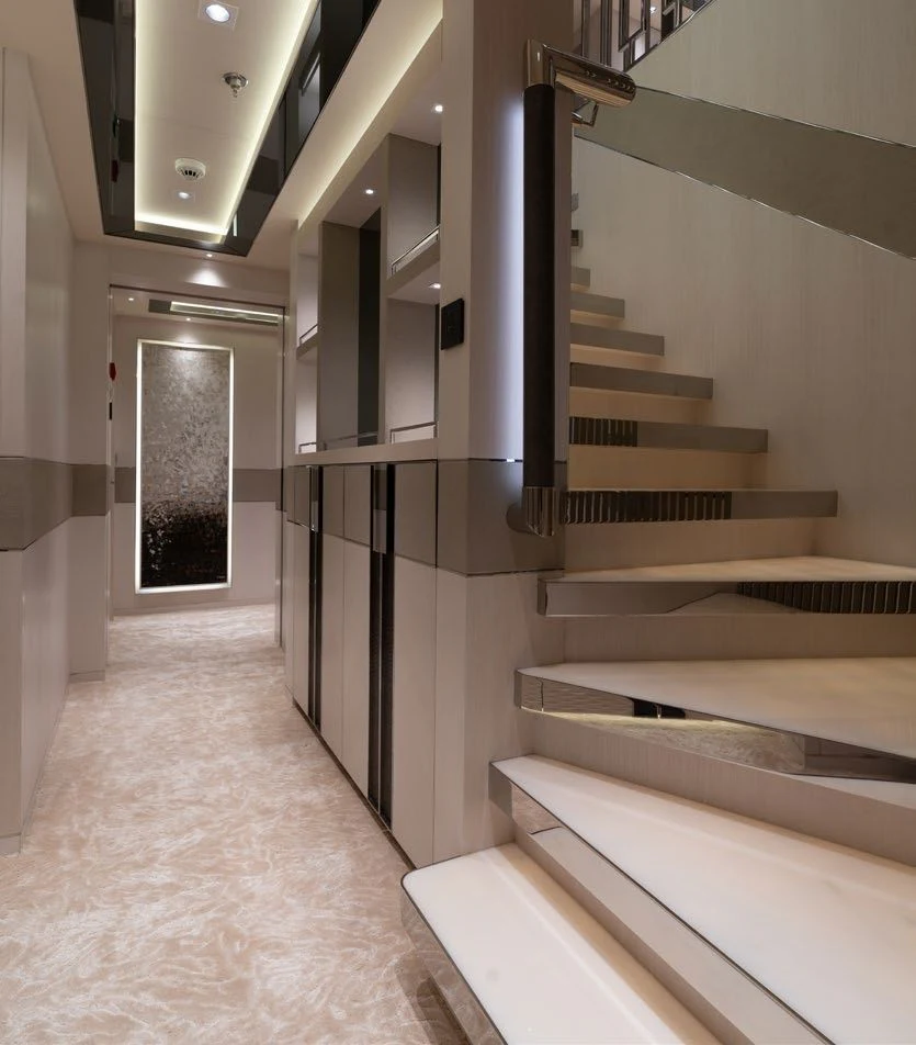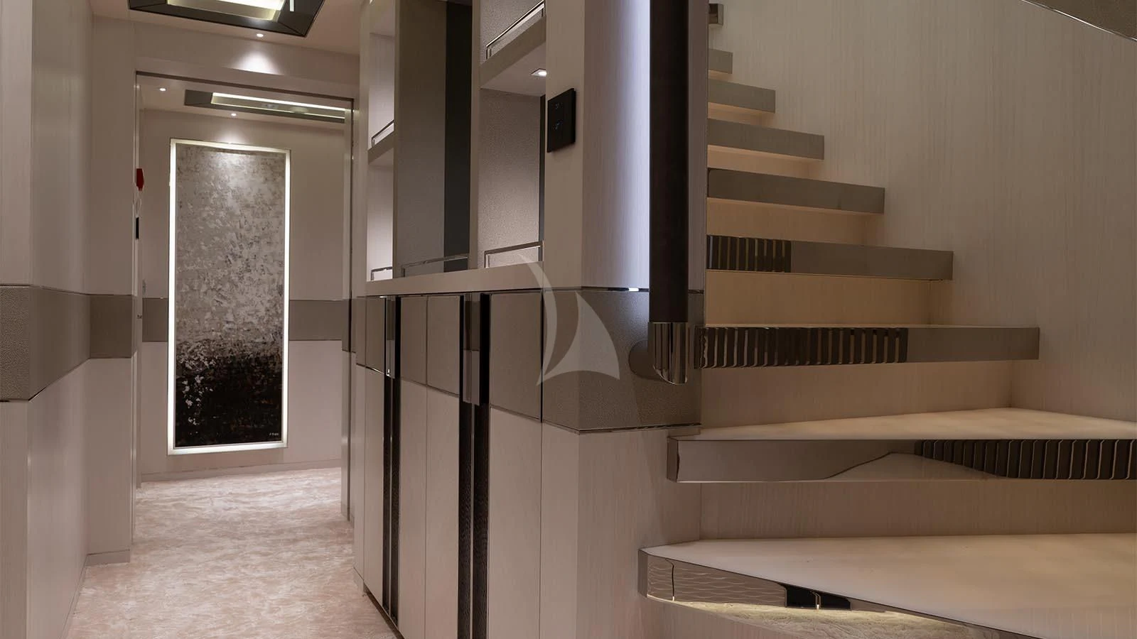 To ensure seamless movement between different levels within this floating palace we have incorporated elevators making every corner accessible without any hassle - be it reaching top-deck for helicopter takeoff or descending into lower deck where engine room lies housing two powerful MTU engines each delivering around 2625 horsepower!