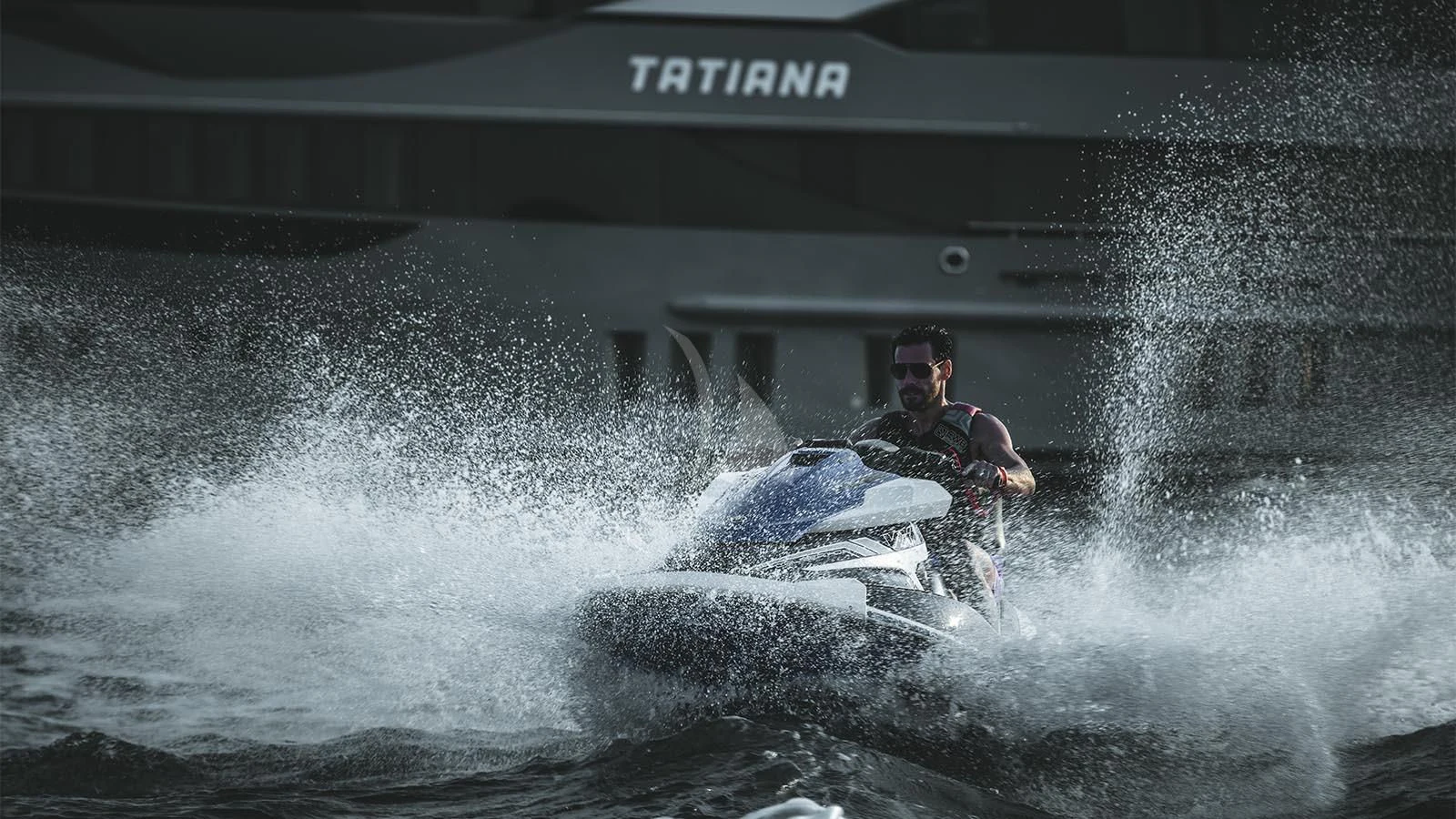 The yacht also houses a tender garage housing various water toys for thrill-seekers looking for aquatic adventures during their voyage on TATIANA. Whether it's cruising on jet skis or diving below surface using advanced scuba gear – all are just steps away from your cabin door.