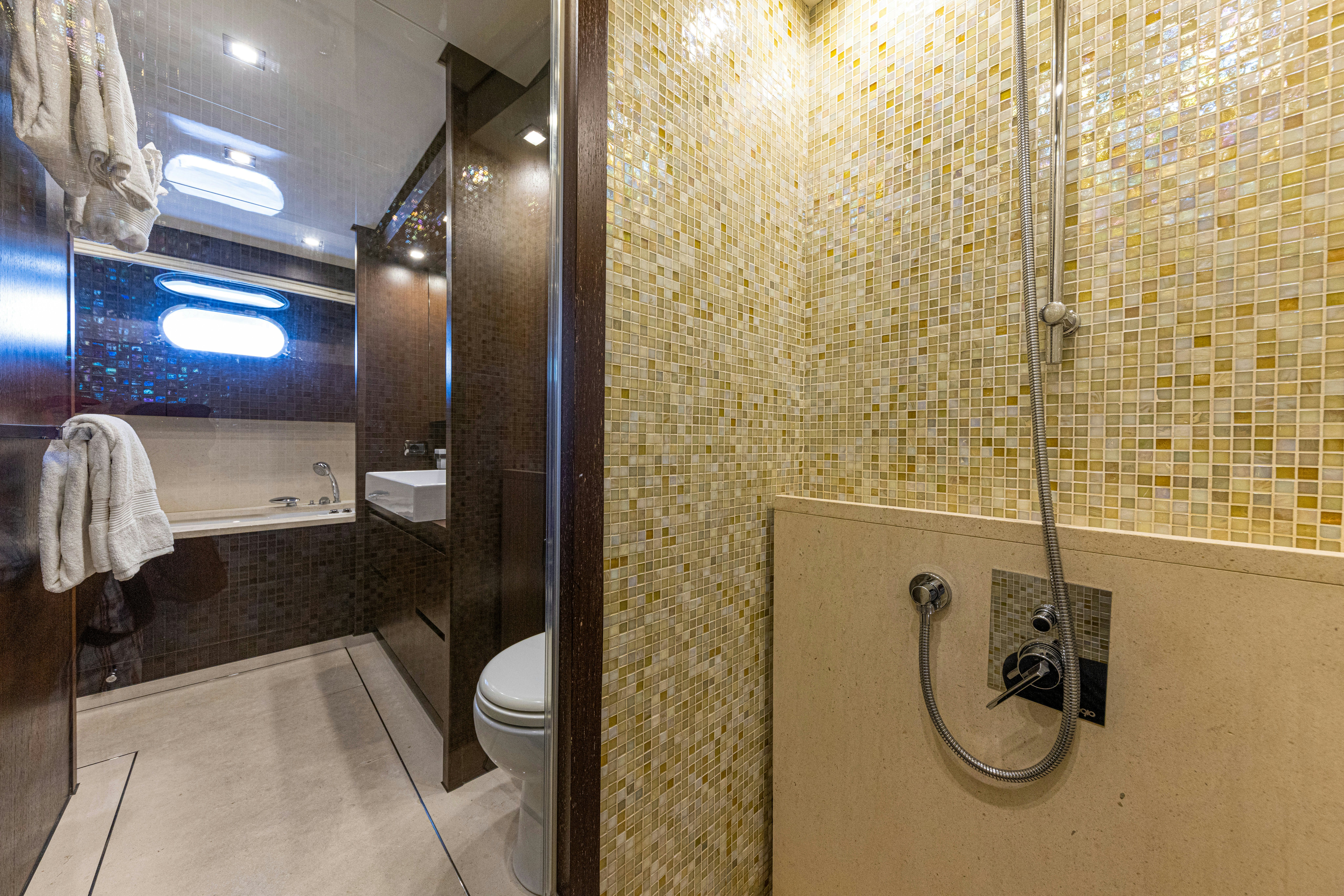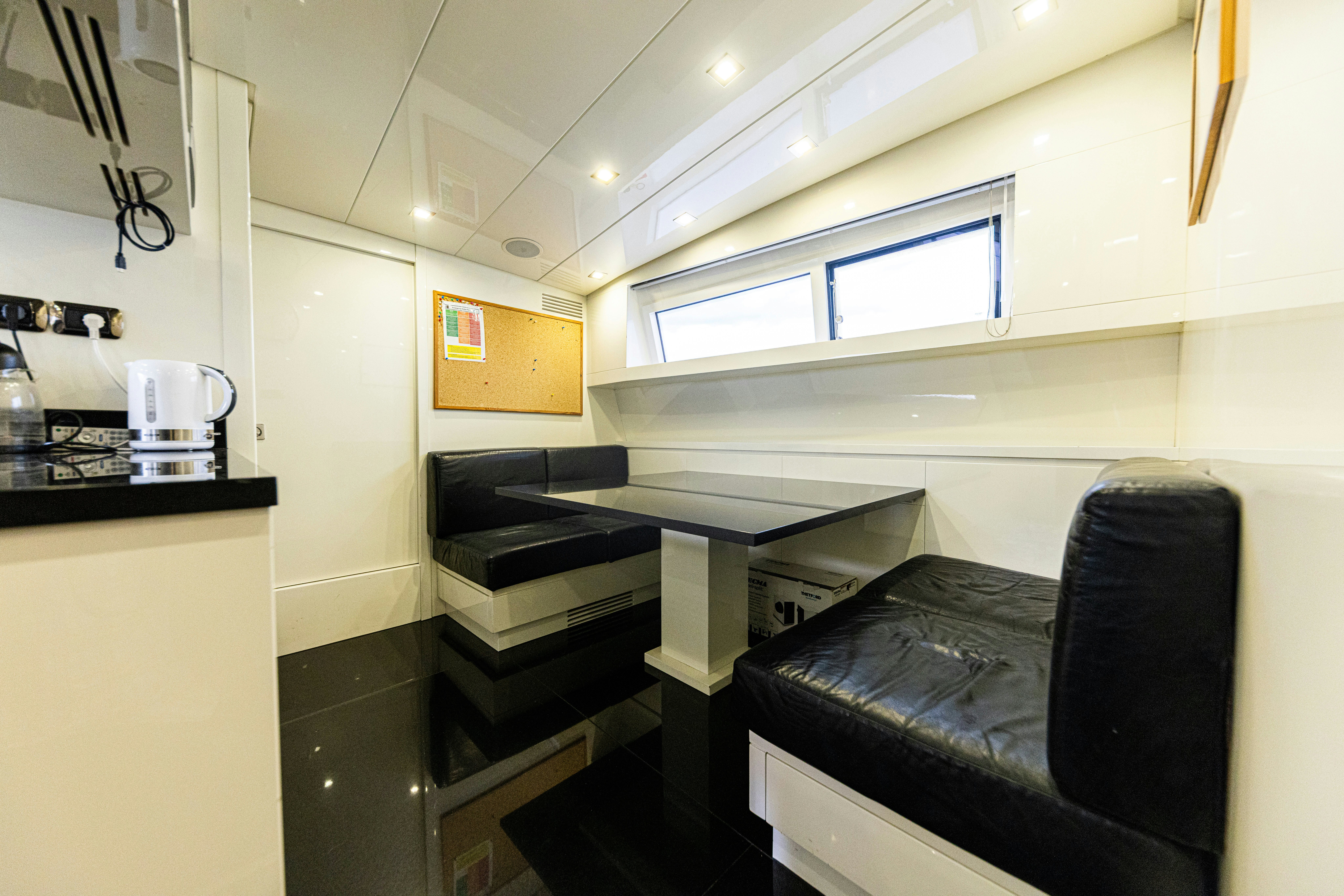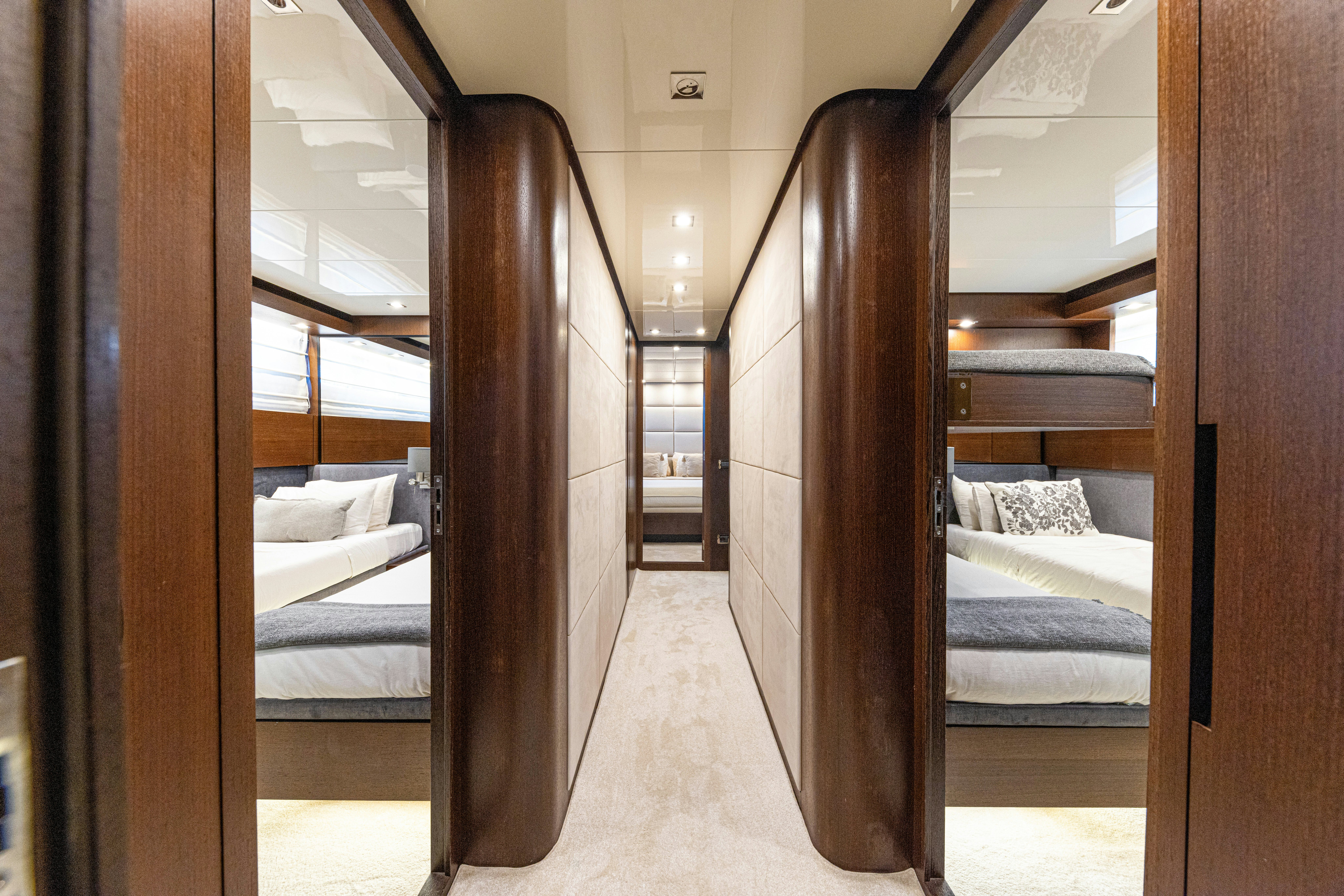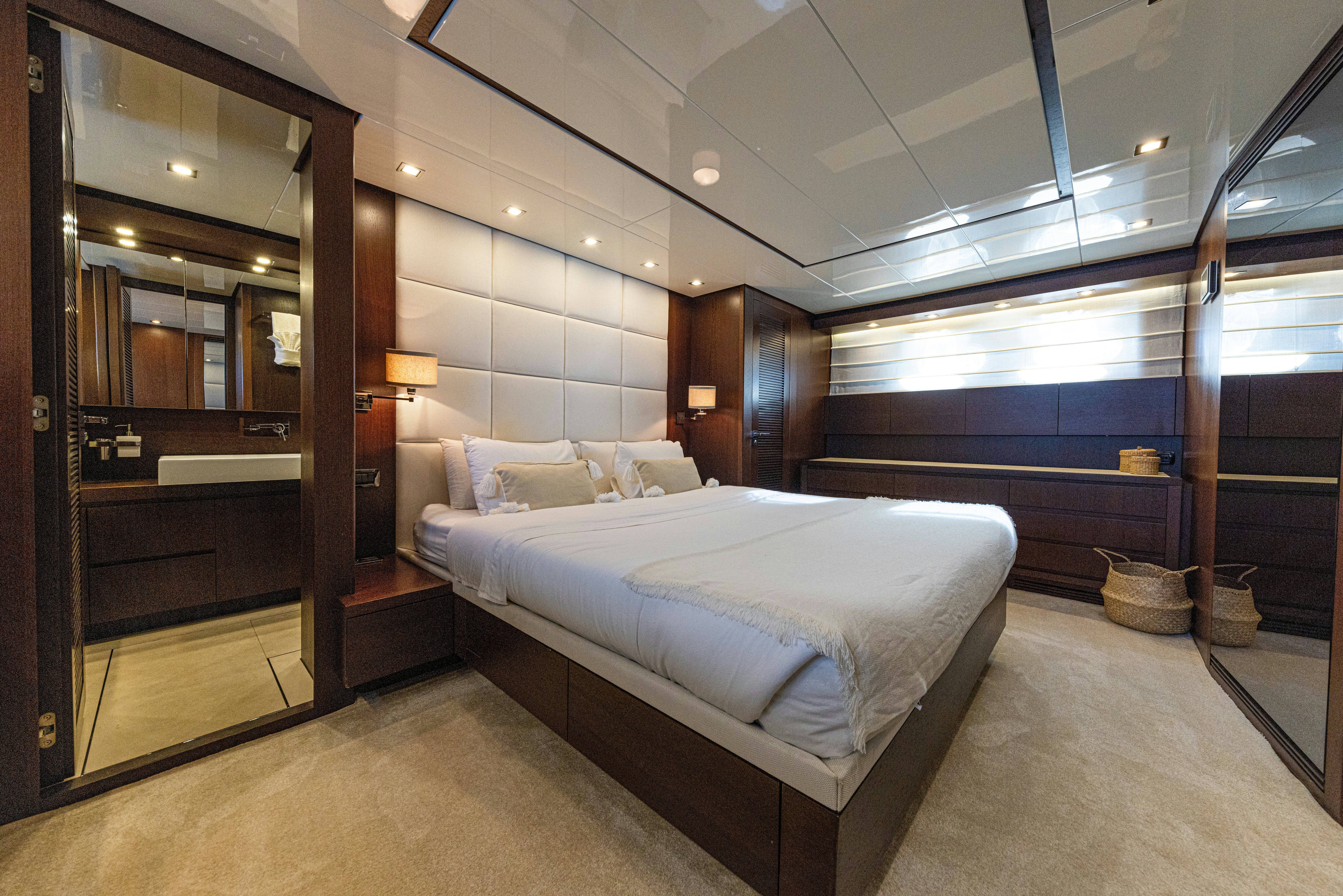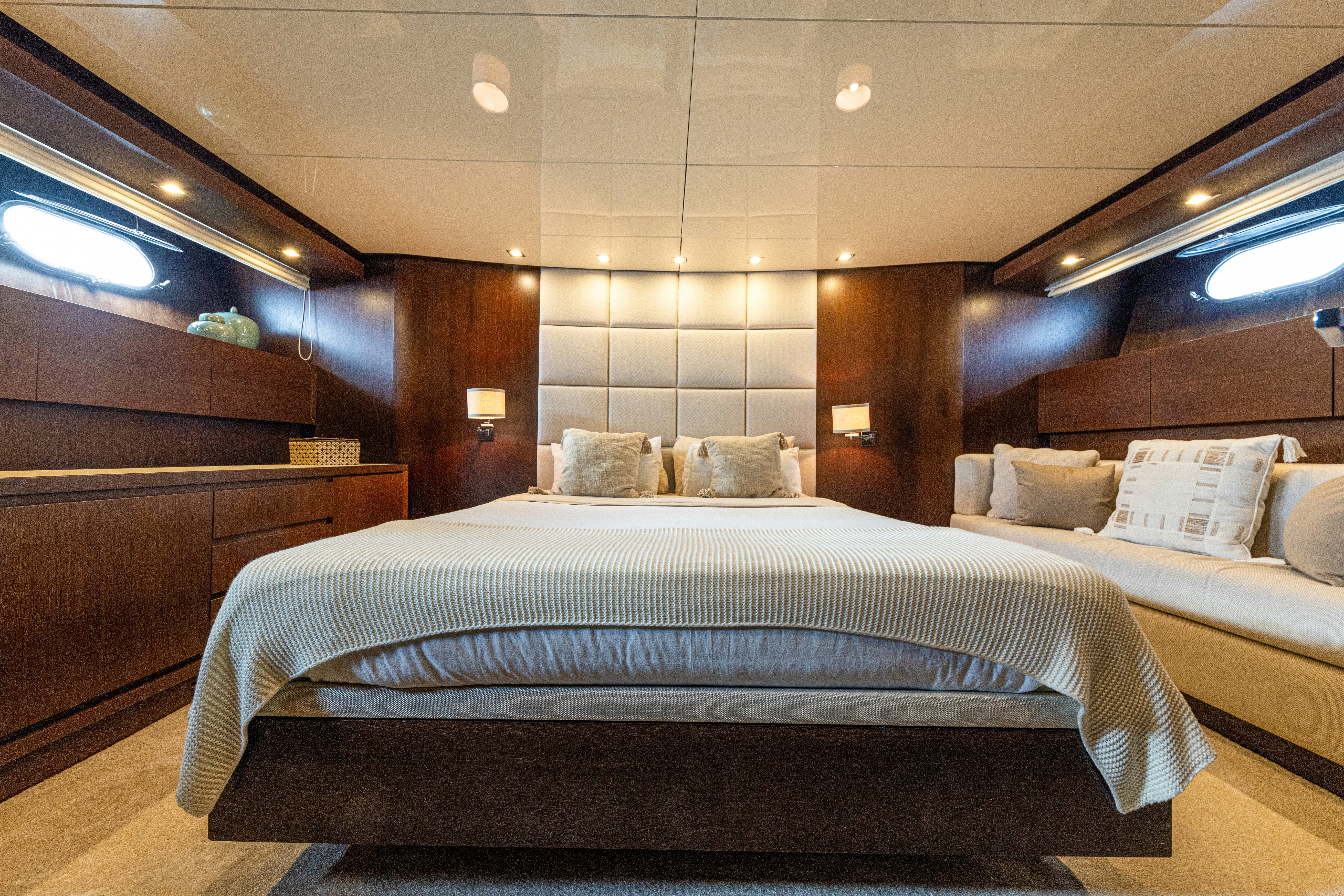 Accommodations are designed to offer comfort and versatility for up to 10 guests across four staterooms. The full-beam master suite, located aft on the lower deck, is a retreat with a king-size bed, a walk-in wardrobe, and an ensuite featuring a Jacuzzi bath. Forward, the VIP cabin also offers a king-size bed and a spacious ensuite. Two guest cabins, each with twin beds and Pullman bunks, provide flexible sleeping arrangements, making them ideal for families or friends. All cabins are finished in rich wenge wood and soft, cream-colored fabrics, with marble-topped bathrooms.