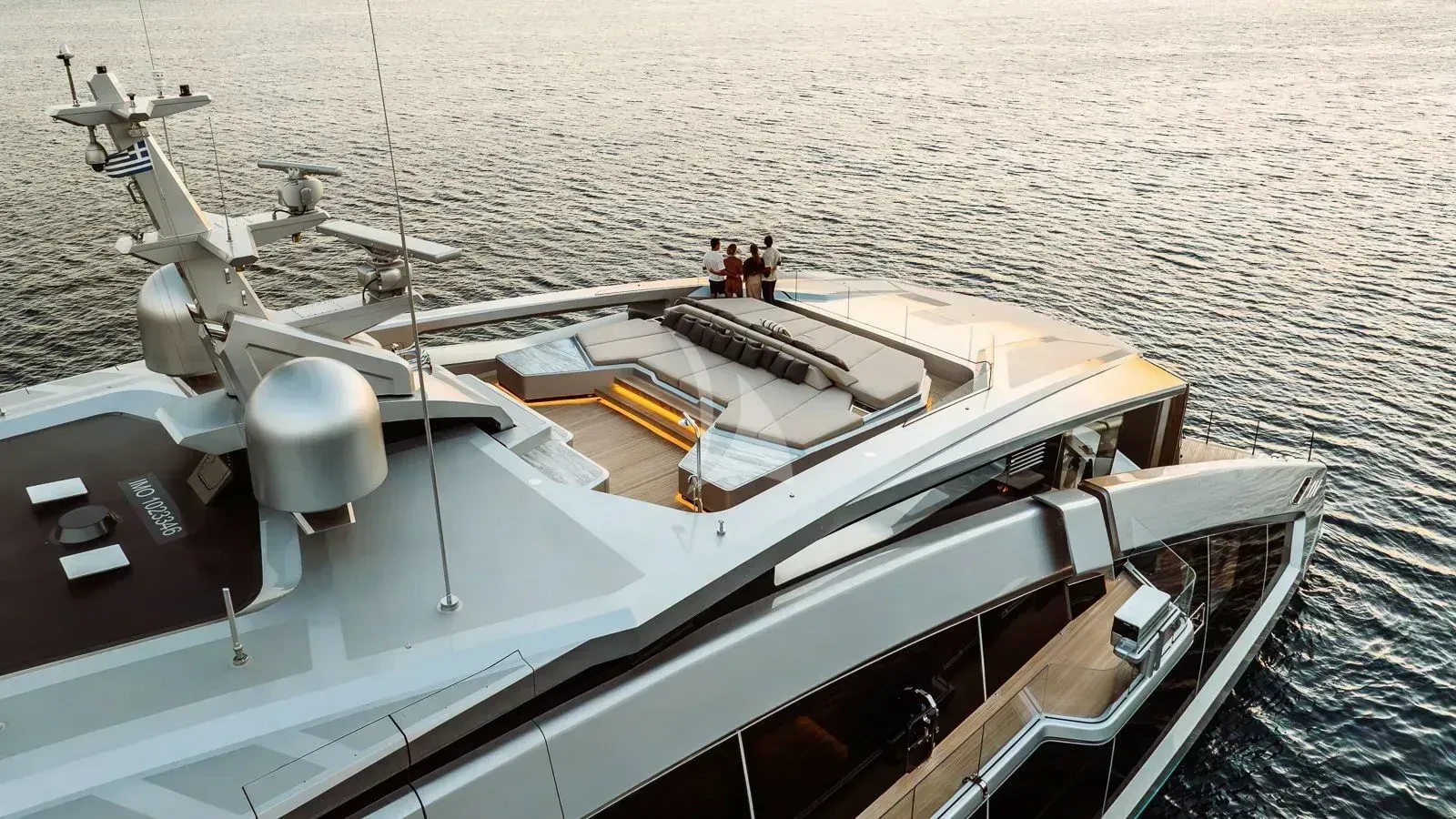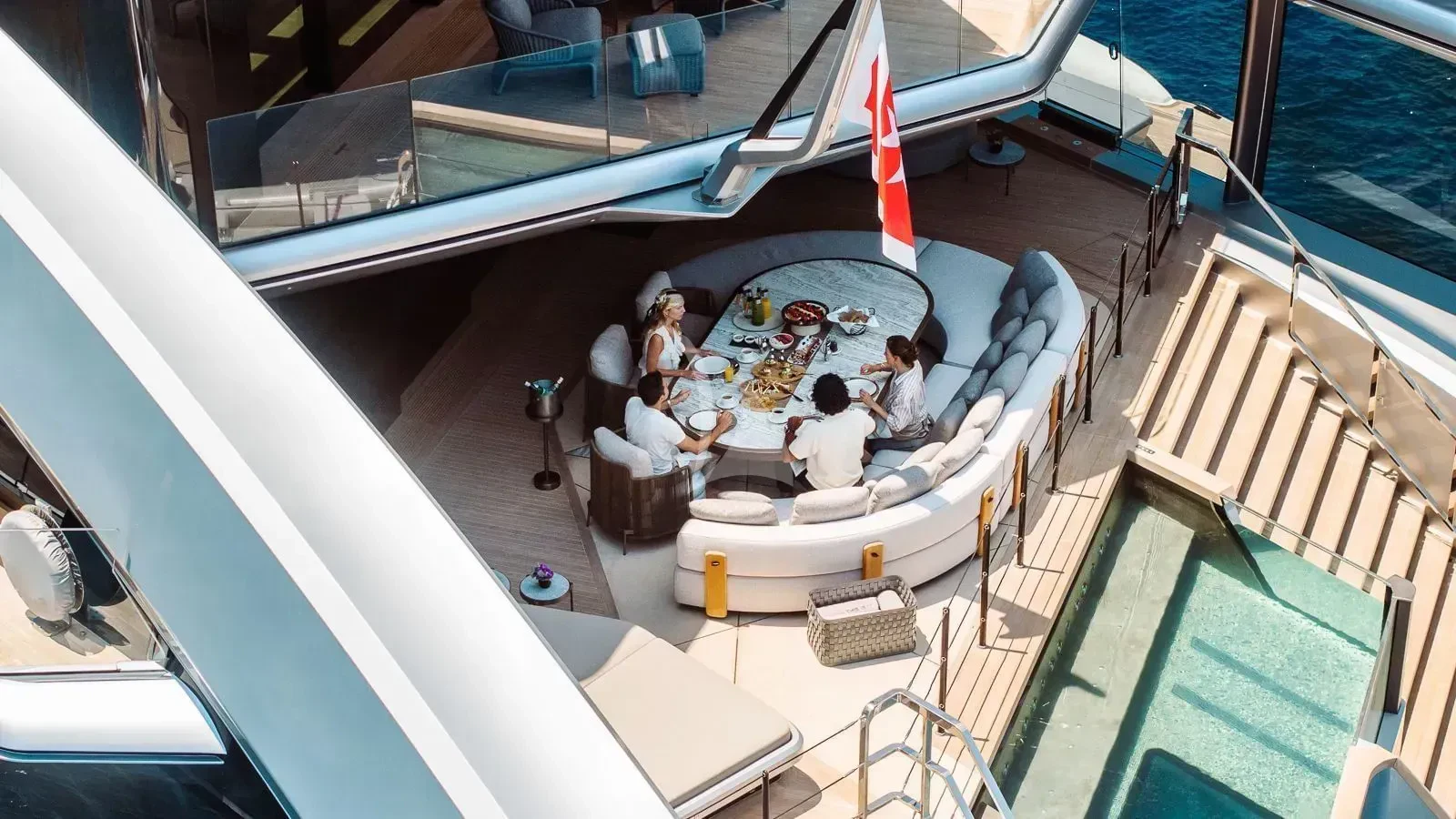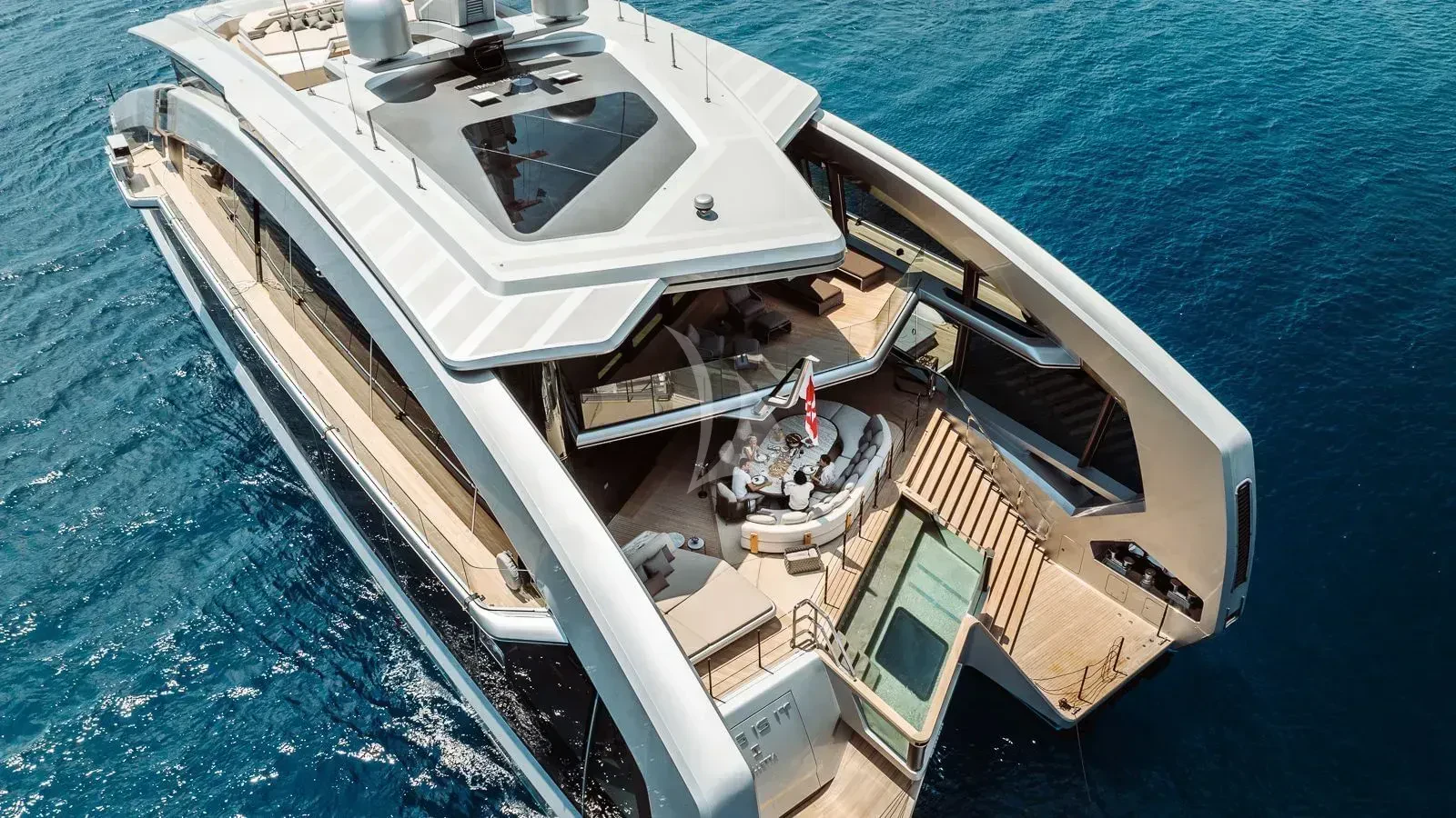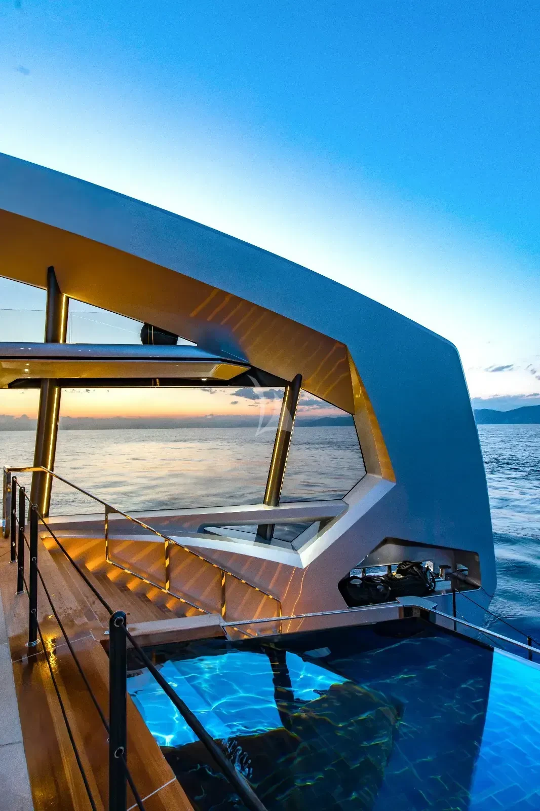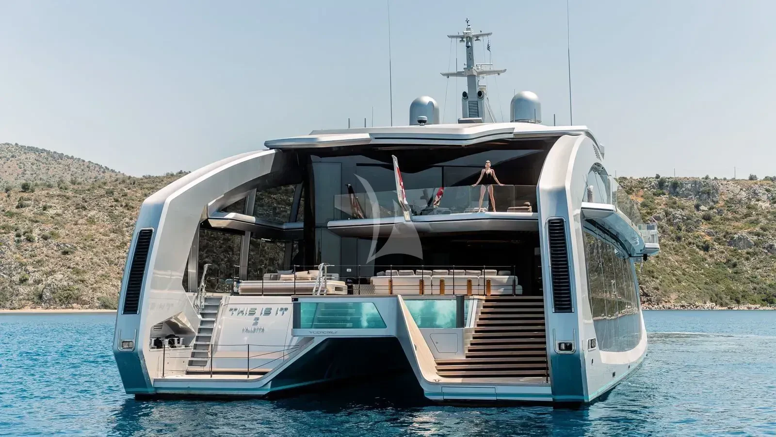 THIS IS IT I's exterior is crafted from robust aluminum, lending it both strength and sleekness. The exterior design showcases a graceful blend of modern lines and timeless elegance that commands attention at every port. Her expansive sundecks are perfect for basking under the sun or enjoying alfresco dining against breathtaking ocean views. Notable exterior features include a lavish swimming pool and a bubbling Jacuzzi - perfect spots for guests to unwind while soaking in panoramic sea vistas.