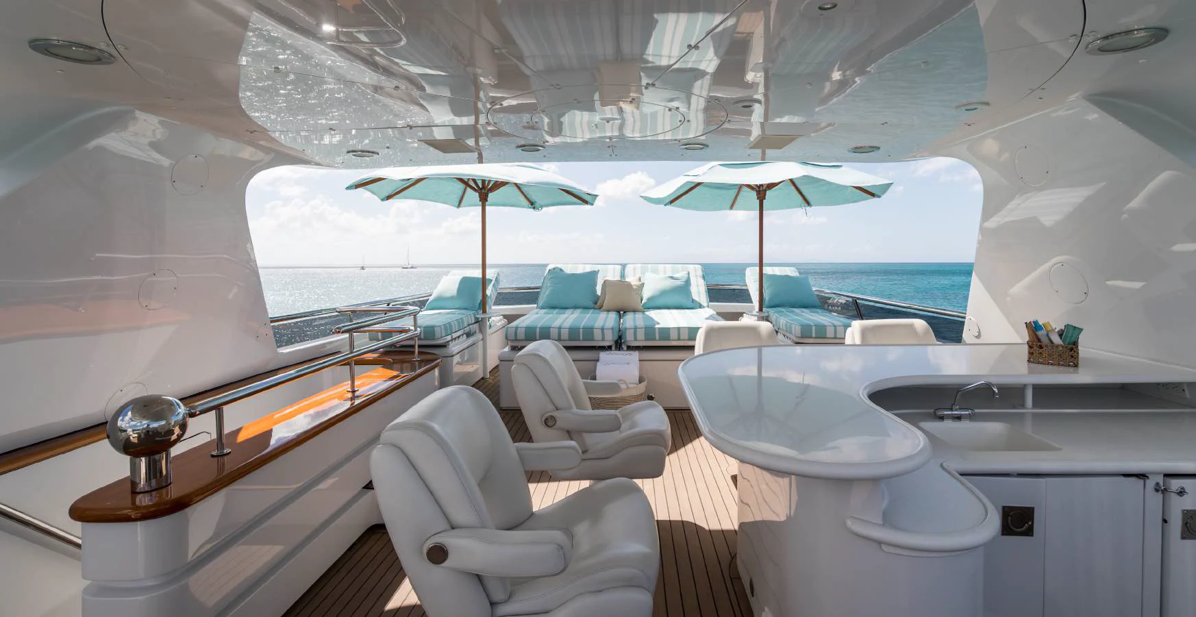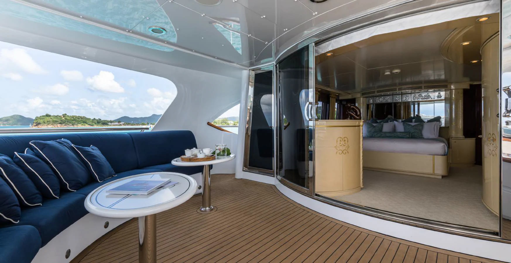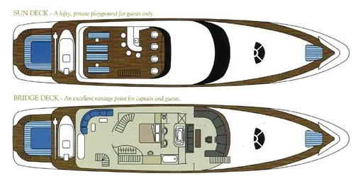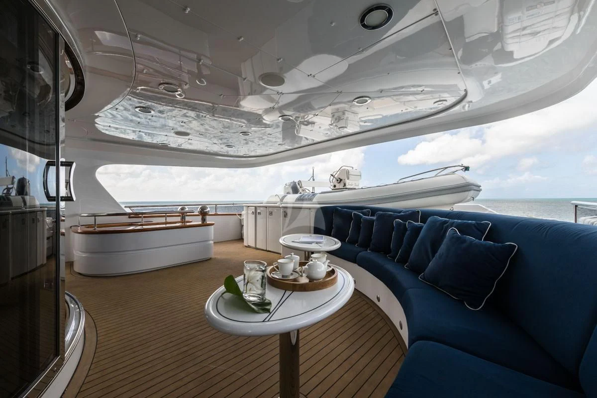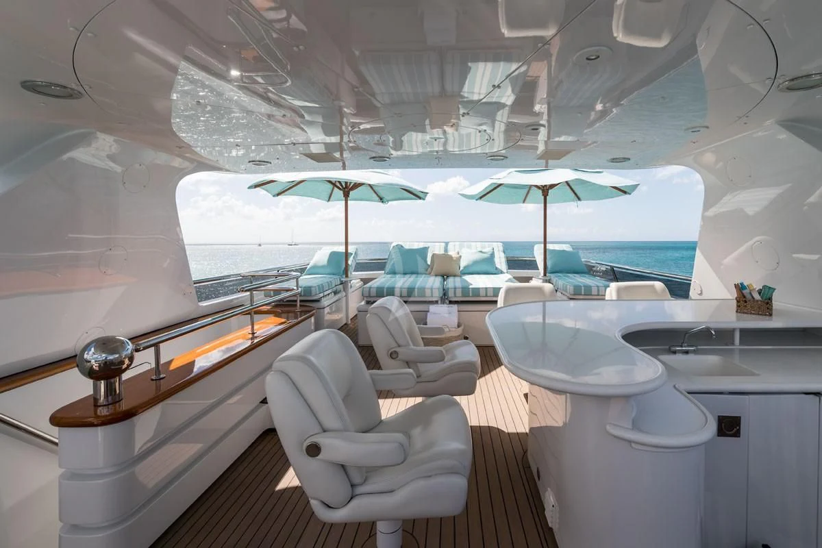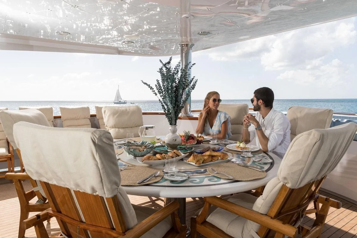 The exterior spaces of TOUCH are thoughtfully designed to offer various options for relaxation or entertainment under the sun or stars. The sundeck is equipped with comfortable loungers perfect for soaking up some rays while sipping on your favorite cocktail prepared by our skilled crew of seven. For those who prefer dining alfresco, there's an outdoor dining area where you can savor gourmet meals while enjoying panoramic views of the sea. And when it’s time to cool down, take a dip in the deck Jacuzzi or dive straight into the clear blue waters from our Passarelle.