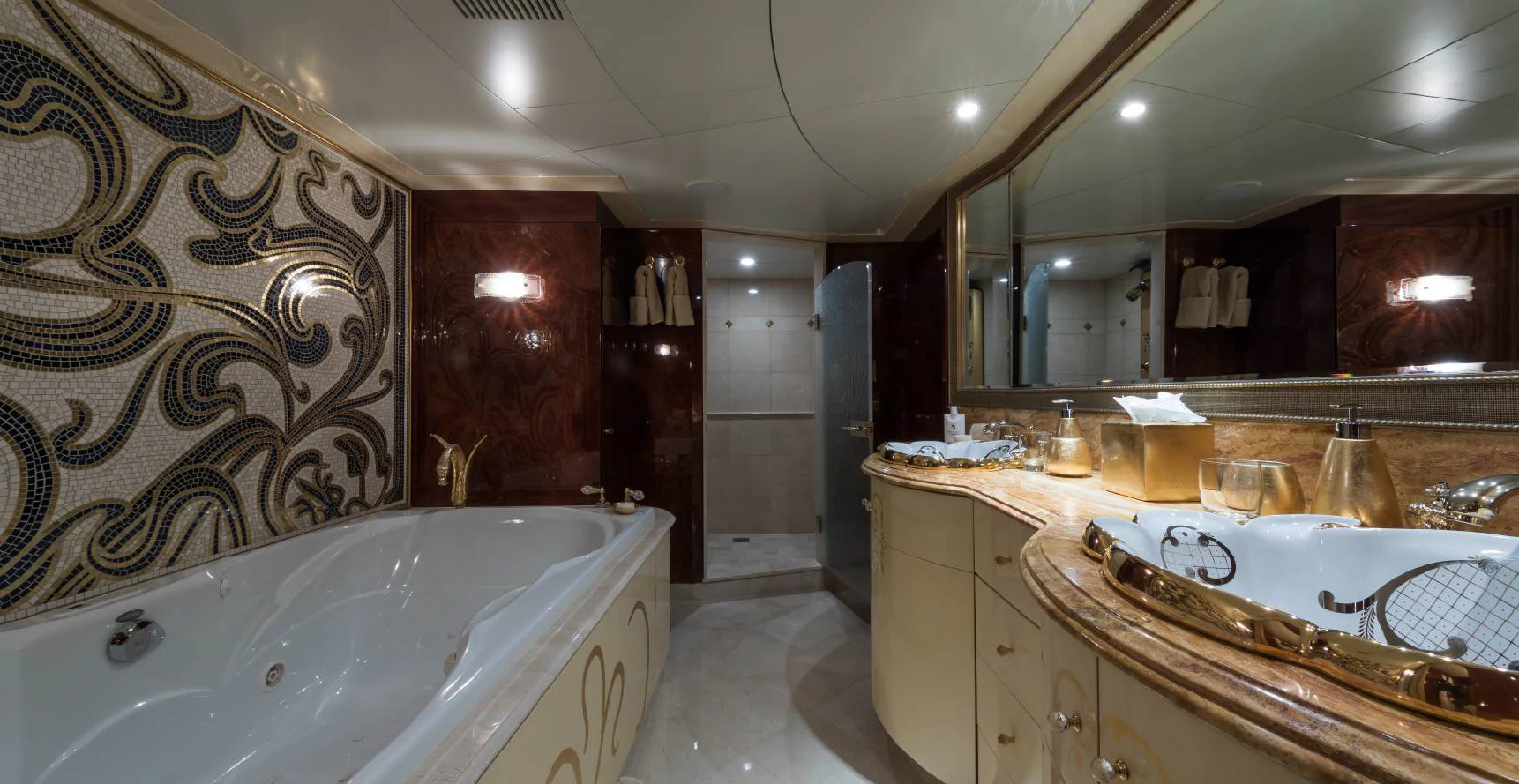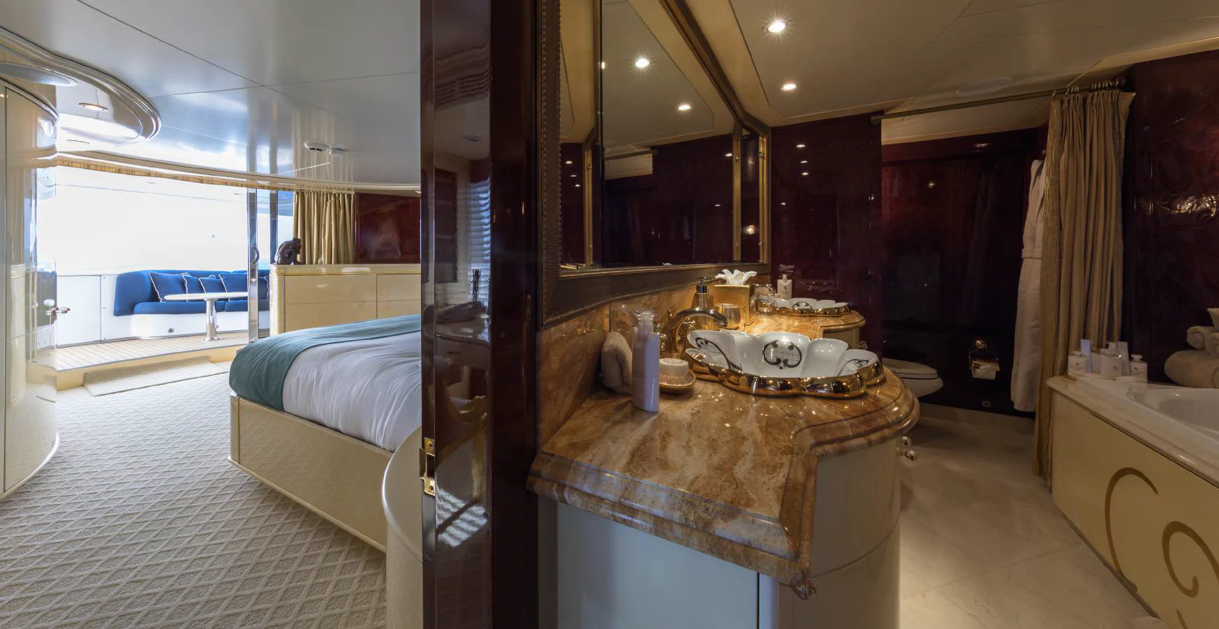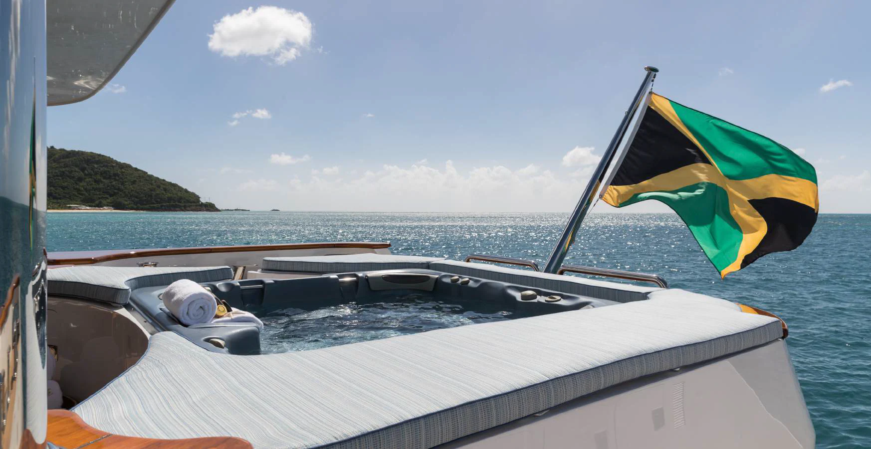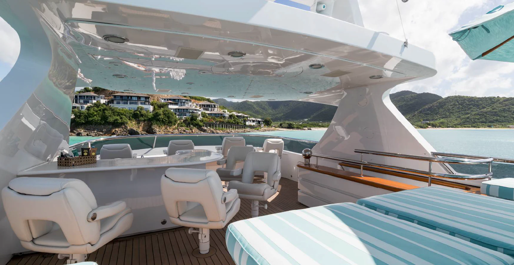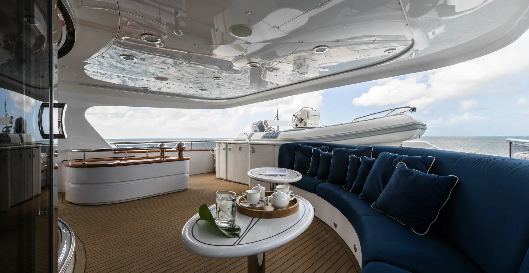 The exterior spaces of TOUCH are thoughtfully designed to offer various options for relaxation or entertainment under the sun or stars. The sundeck is equipped with comfortable loungers perfect for soaking up some rays while sipping on your favorite cocktail prepared by our skilled crew of seven. For those who prefer dining alfresco, there's an outdoor dining area where you can savor gourmet meals while enjoying panoramic views of the sea. And when it’s time to cool down, take a dip in the deck Jacuzzi or dive straight into the clear blue waters from our Passarelle.