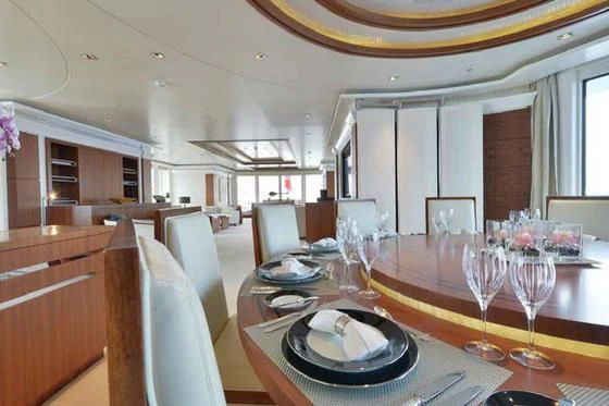 The exterior design of TRIPLE SEVEN is a testament to elegant simplicity and timeless style. Her steel hull cuts through the water with grace and power, driven by two MTU engines boasting 2360 horsepower each. With a cruising speed of 14 knots and a maximum speed of 17 knots, she offers both tranquility and thrill for those on board. Her generous beam measures at 39 feet (12.6 meters), providing ample space for outdoor relaxation or entertainment under the sun or stars.