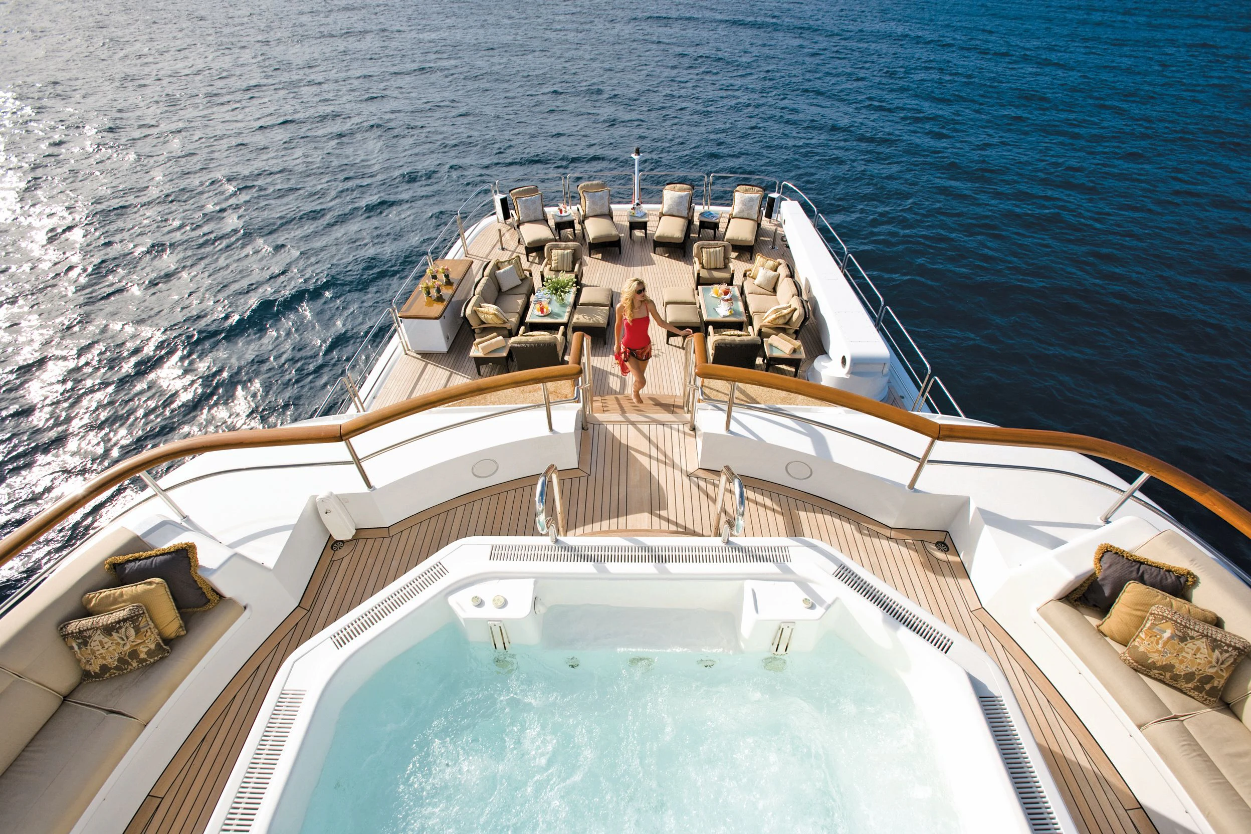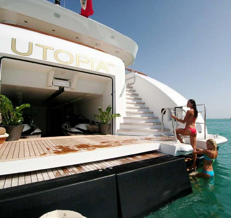 Moreover, UTOPIA comes equipped with world-class amenities including a Jacuzzi for those soothing dips under the starlit sky, a state-of-the-art gym catering fitness enthusiasts on board, and not one but two elevators providing effortless access across her expansive decks. Adding further charm is her helipad which allows guests arriving via helicopter direct access onboard - an undeniable symbol of prestige.