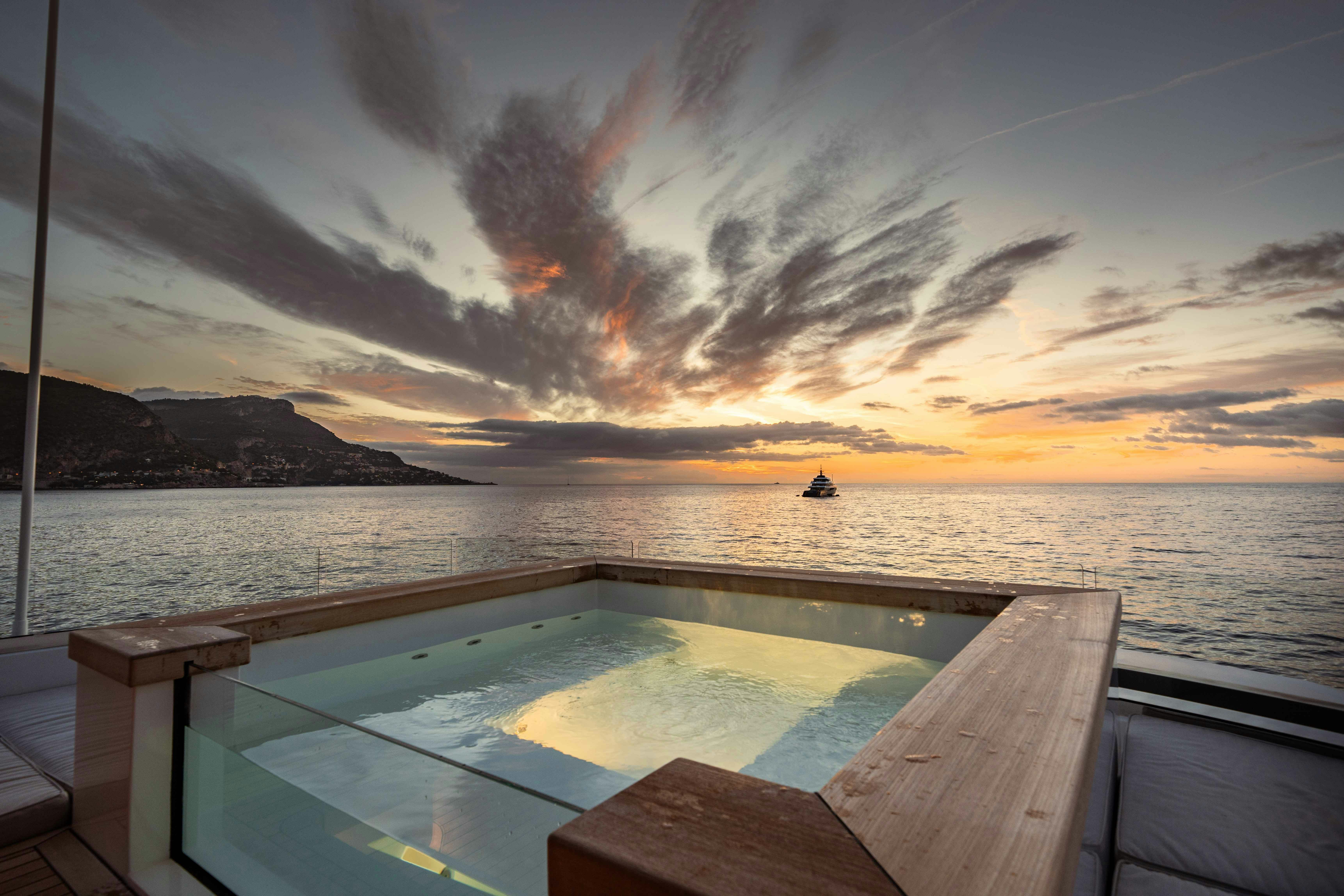 VAYUS's exterior, also designed by VYD studio, offers a large aft deck with a swimming platform, an upper deck with versatile salon space and a cinema projector and a sundeck with a freshwater Jacuzzi, sunpads and a fully equipped bar. The spacious aft deck with its swimming platform is ideal for social activities and water sports, and features a saltwater large Jacuzzi and extensive comfortable sofas. The foredeck provides additional sunpads and tables for relaxation. The yacht's garage includes space for a 5.65m Williams jet tender and a Jet Ski, accessed via a side door. More private seating can be found on the foredeck. This is a nice space to break away into smaller groups and sit back to watch the unobstructed views.