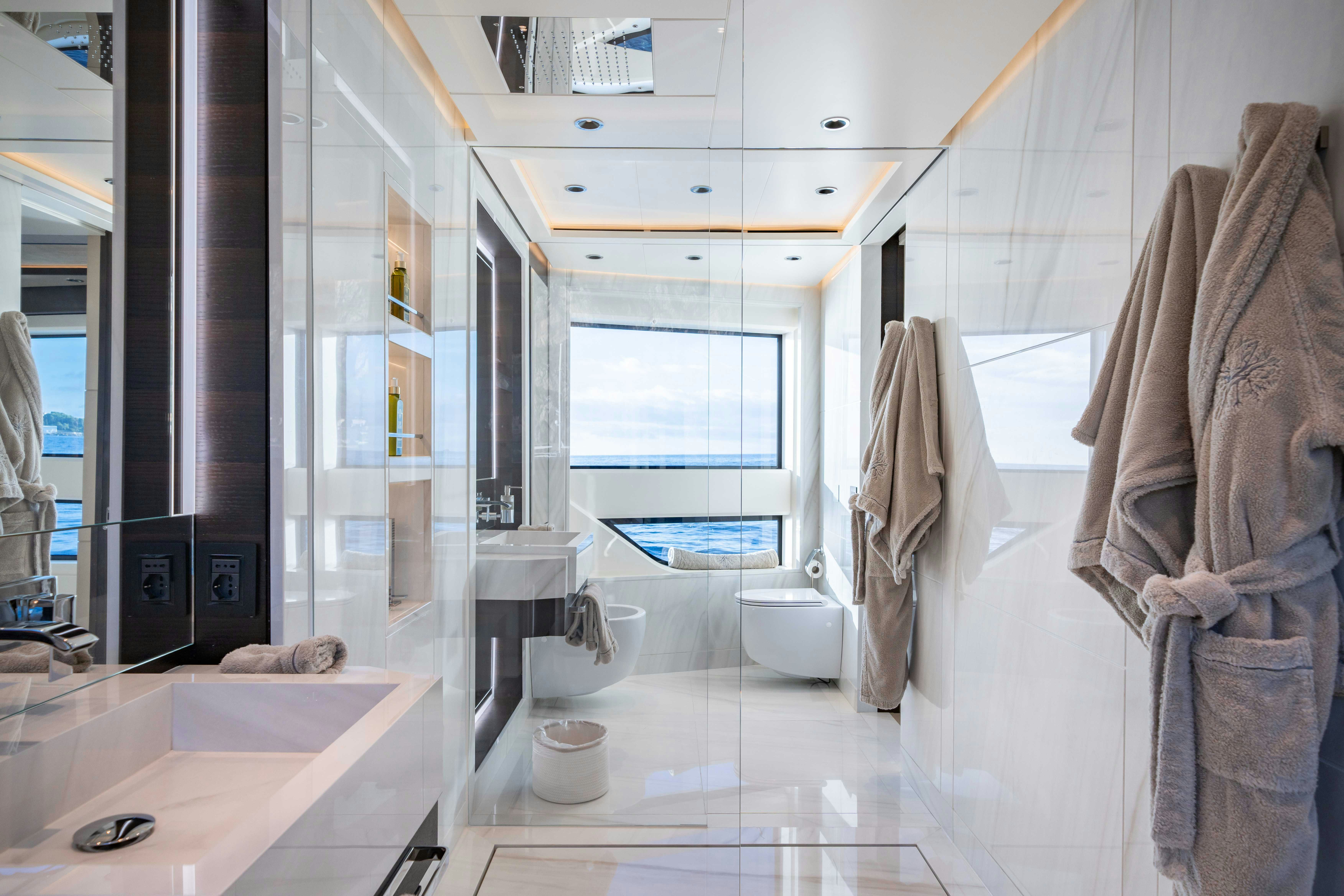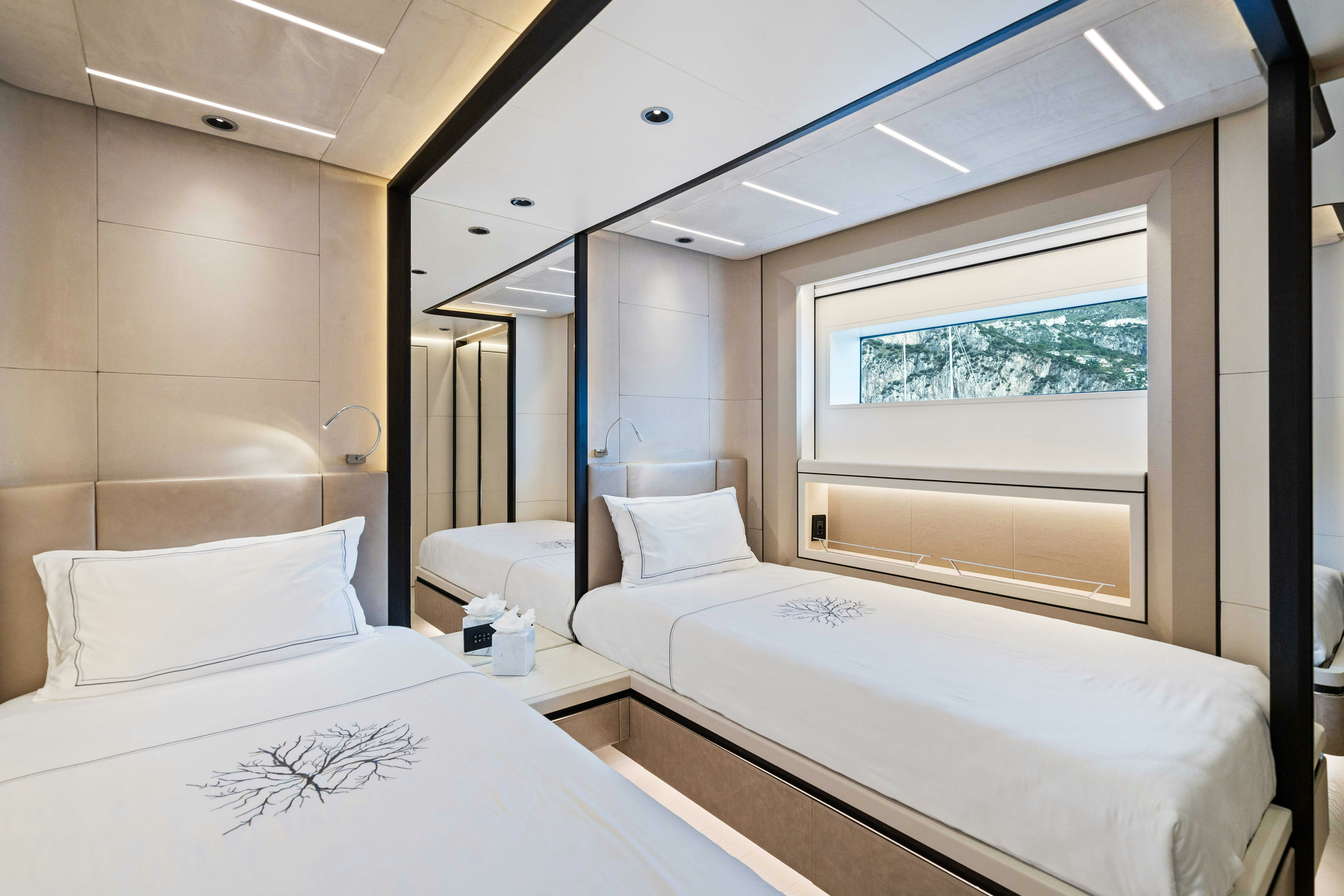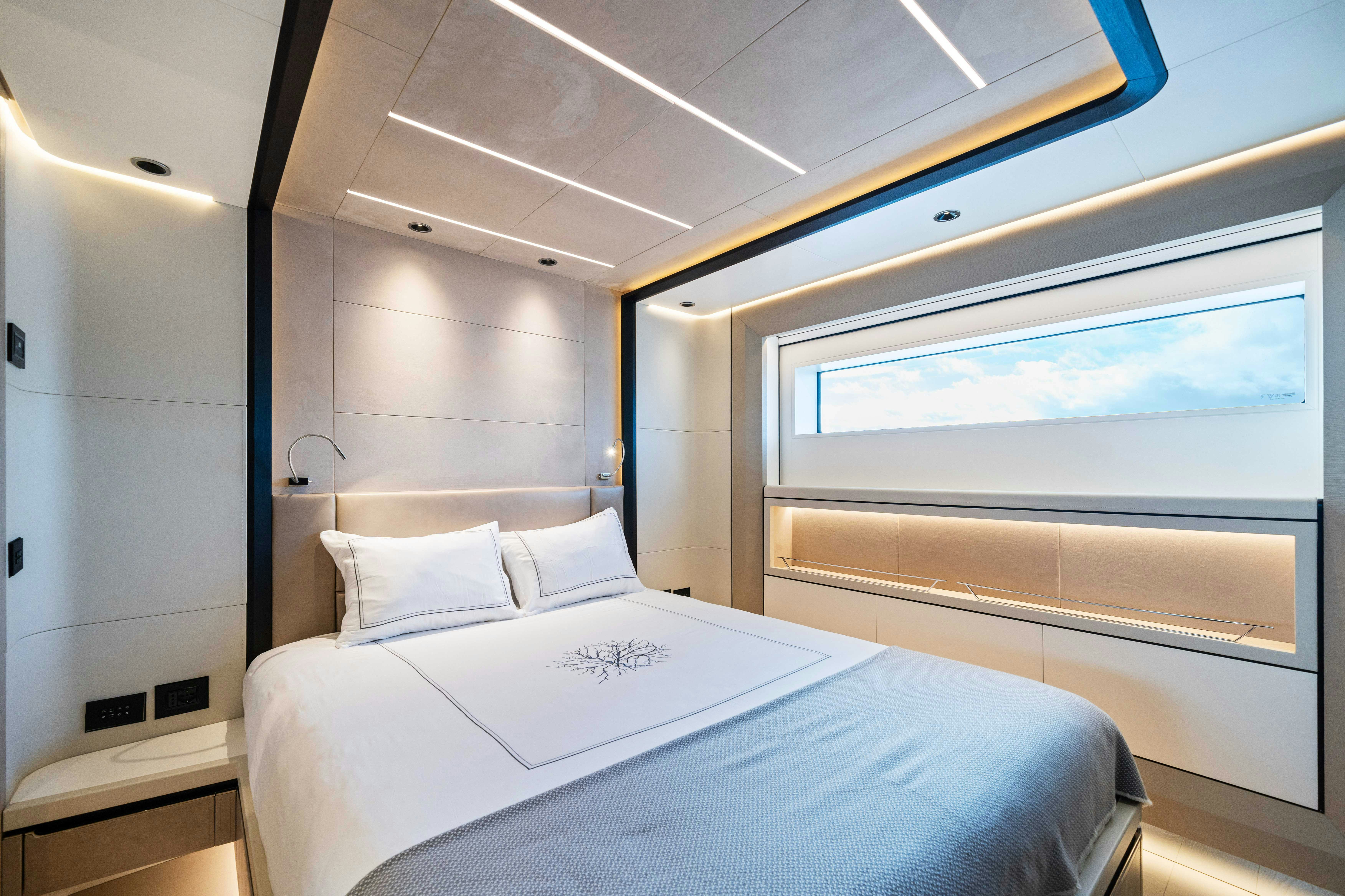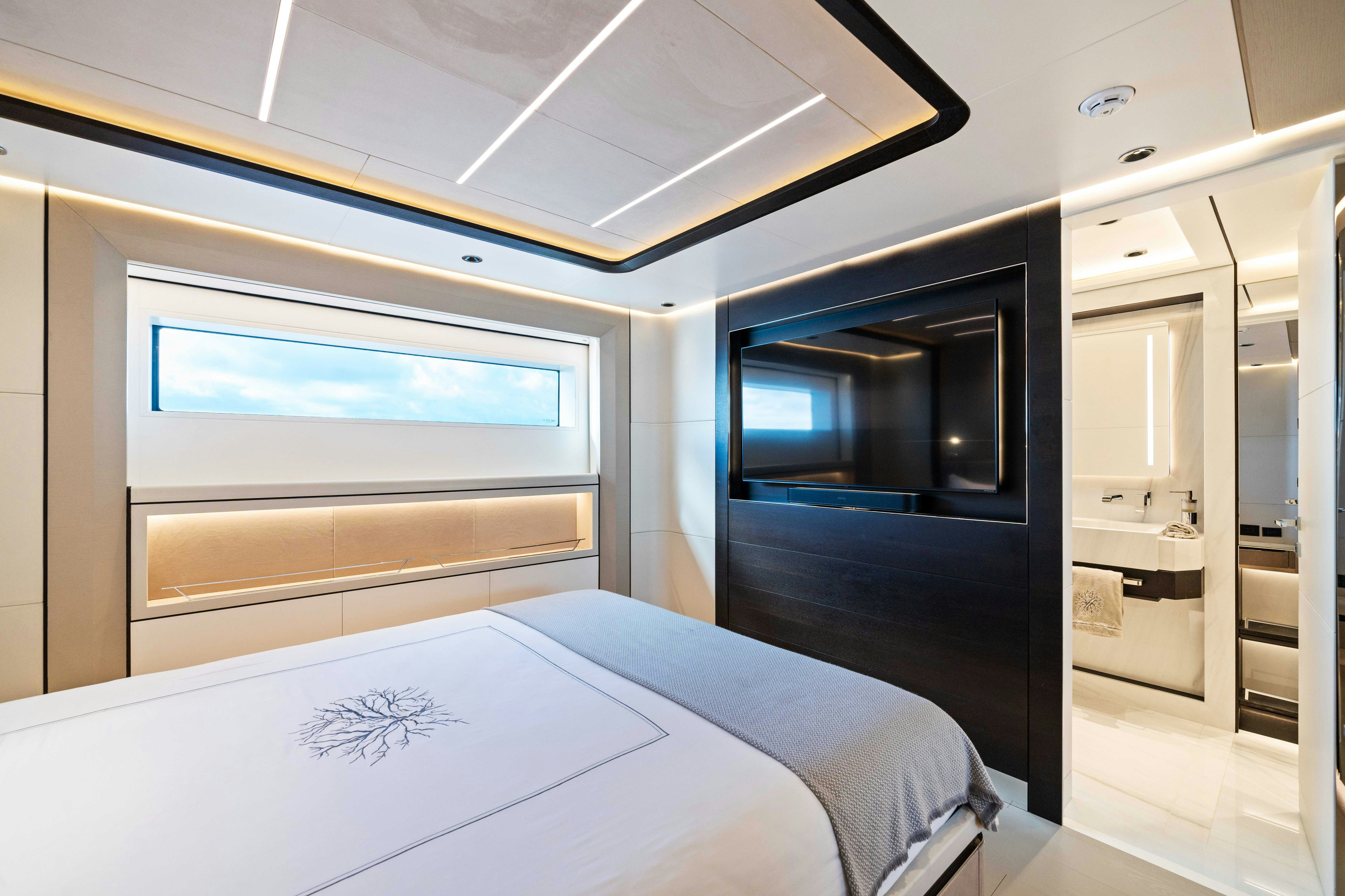 VAYUS showcases the exquisite design of VYD studio on her interior. The main salon, with floor-to-ceiling windows and the ability to open on three sides, creates a seamless connection with the sea. The professional galley is equipped with high-quality appliances and ample storage, including six fridges with freezers. There is a dedicated cinema area on the upper deck that can be opened to allow a natural sea breeze or closed with A/C when desired. Accommodations include five luxurious cabins for up to 10 guests and quarters for a crew of seven. The owner’s suite is a sanctuary with expansive windows, elegant furnishings, and a waterfall shower in the en-suite bathroom. Guest cabins feature larger-than-usual double beds, soundproofing, and high-quality finishes mirroring the owner's suite with a focus on wellness, luxury and high-quality materials.