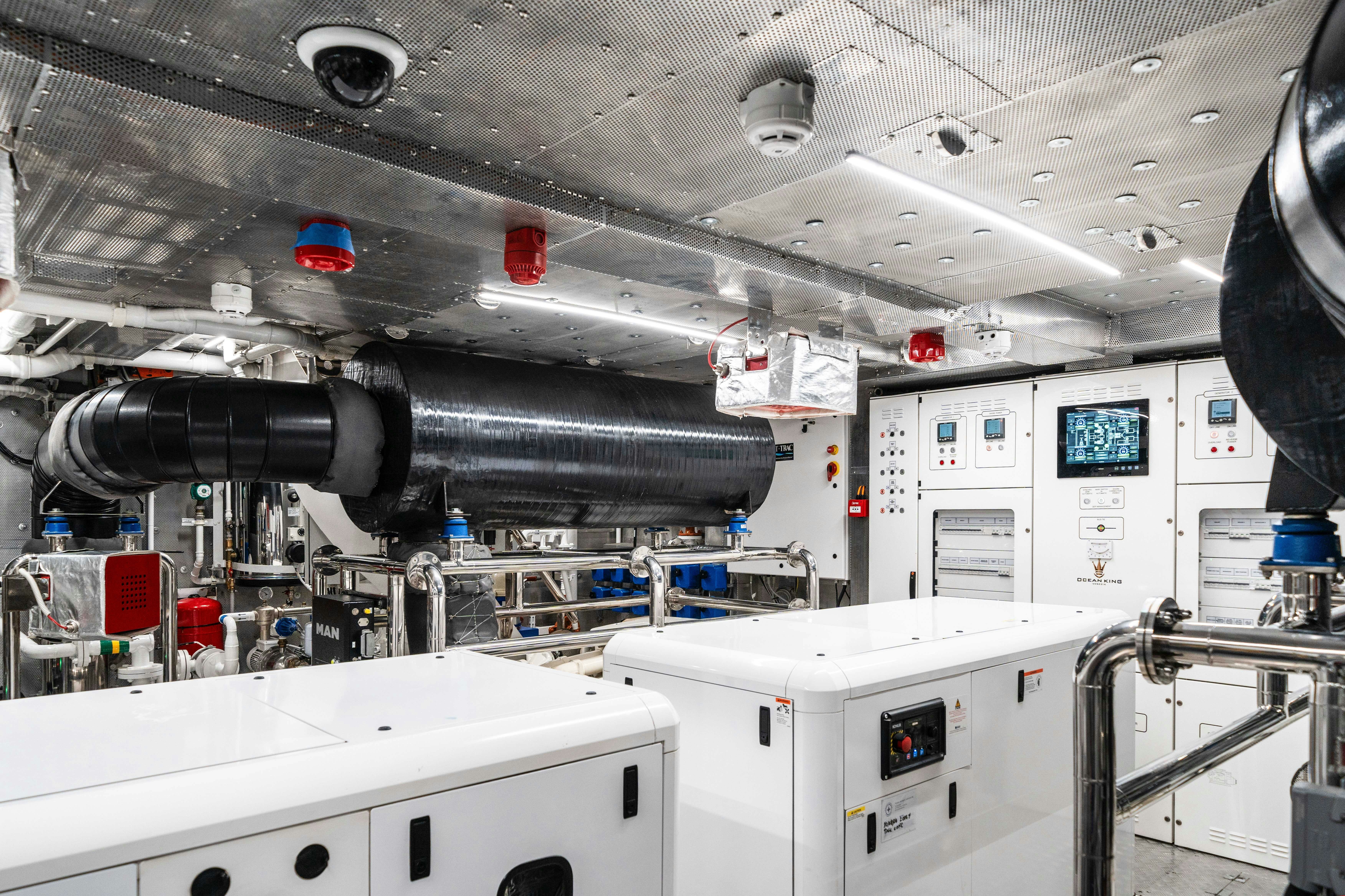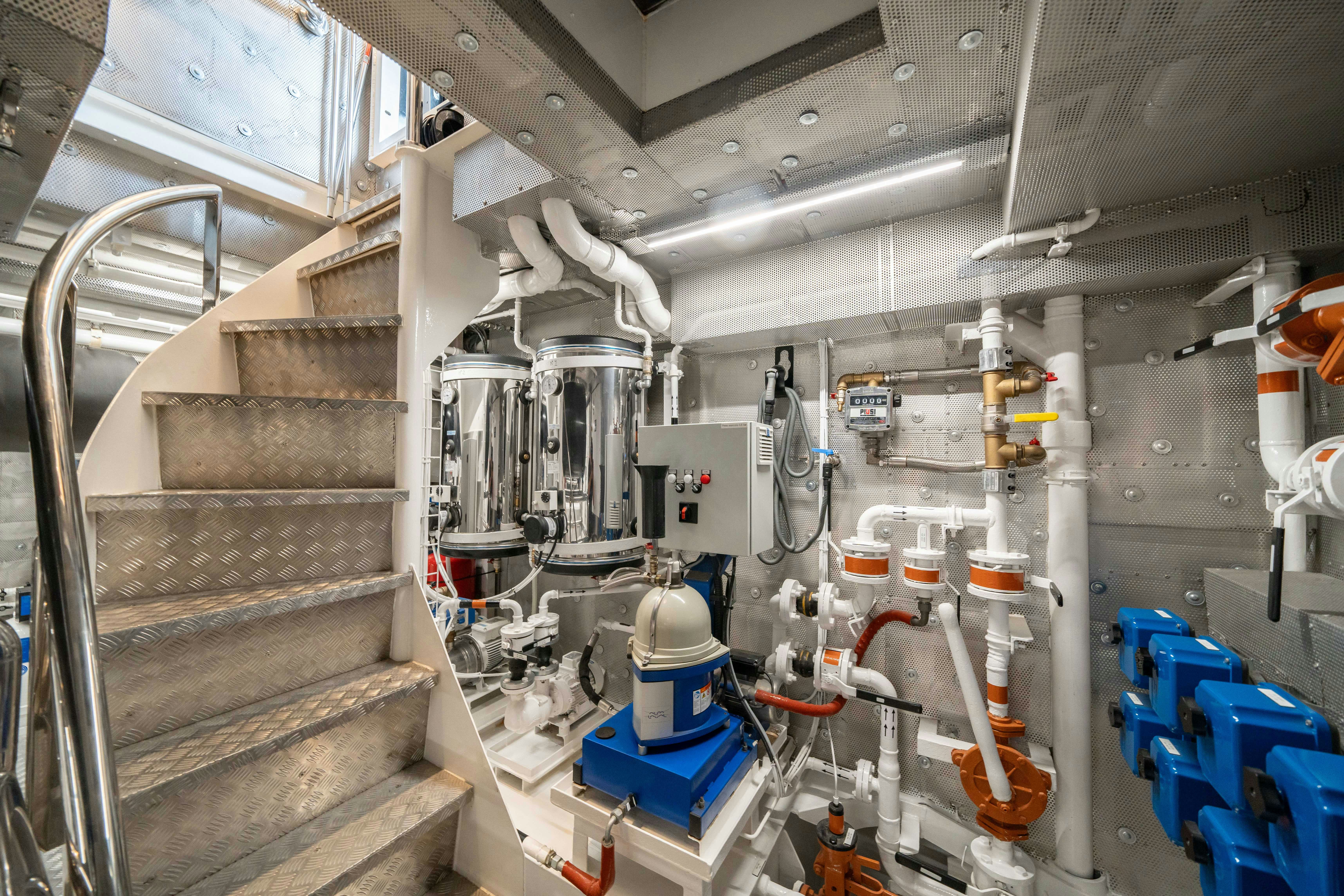 Powered by two MAN 588kw engines and boasting a 50,000-liter fuel capacity, VAYUS offers a remarkable 5,500 nm range. The yacht cruises at 12 knots and reaches a top speed of 14 knots and is equipped with stabilizers, ensuring a smooth journey.