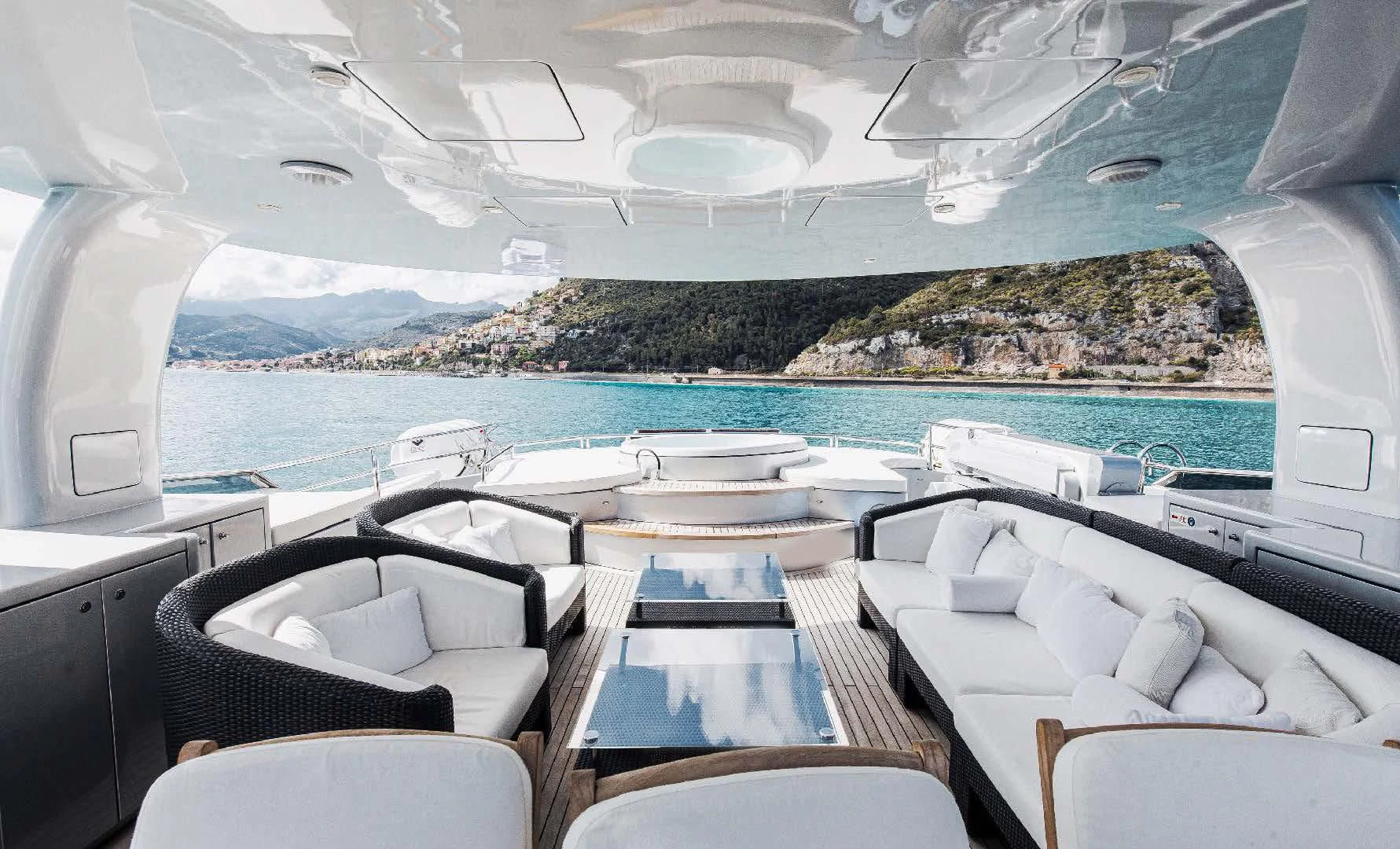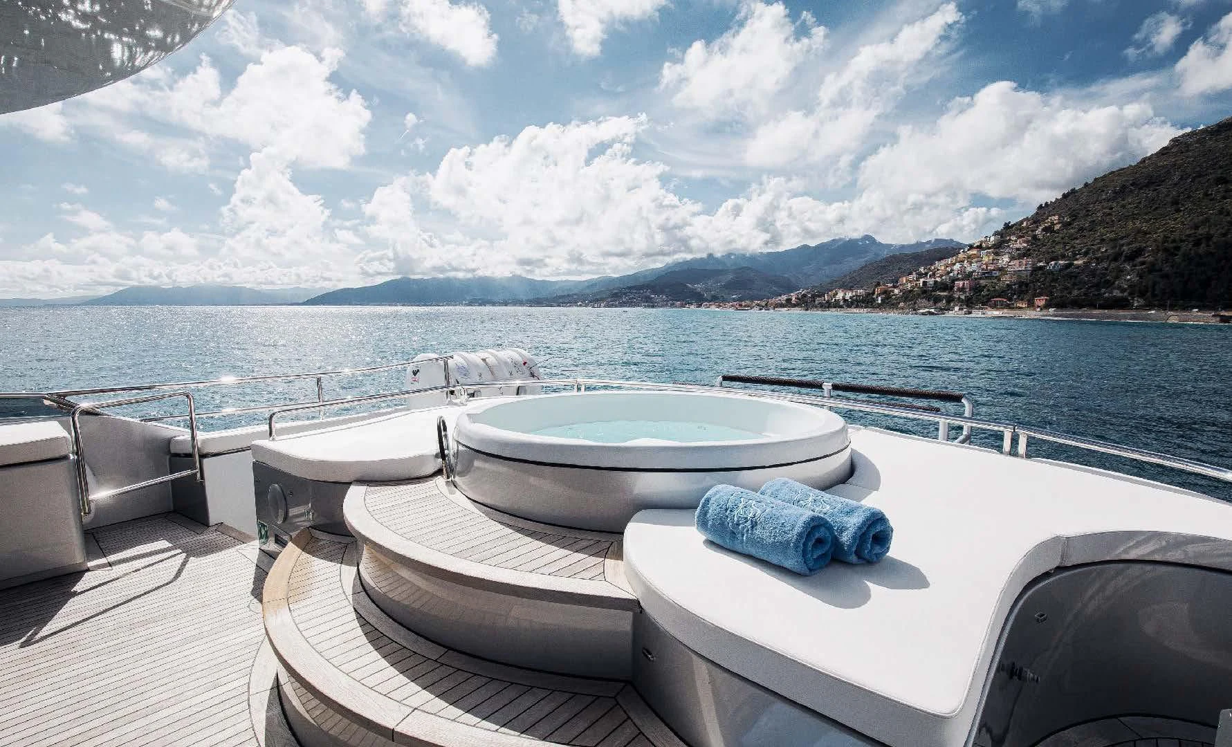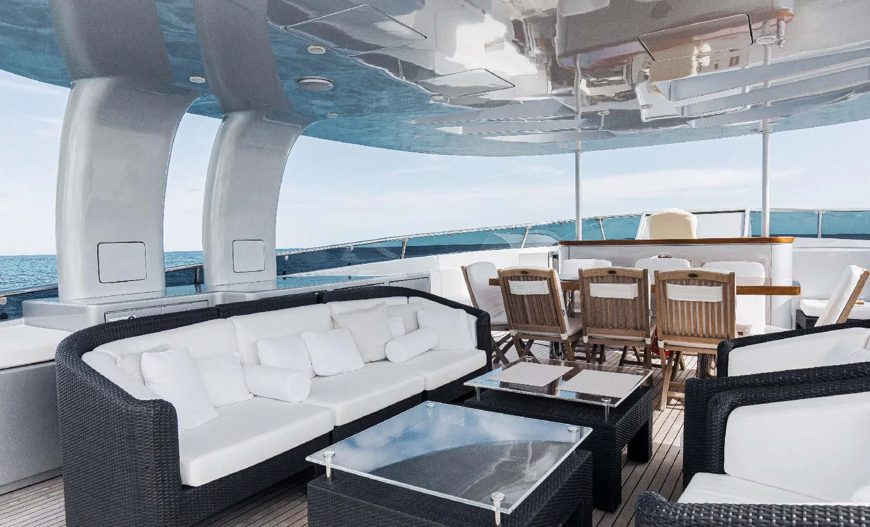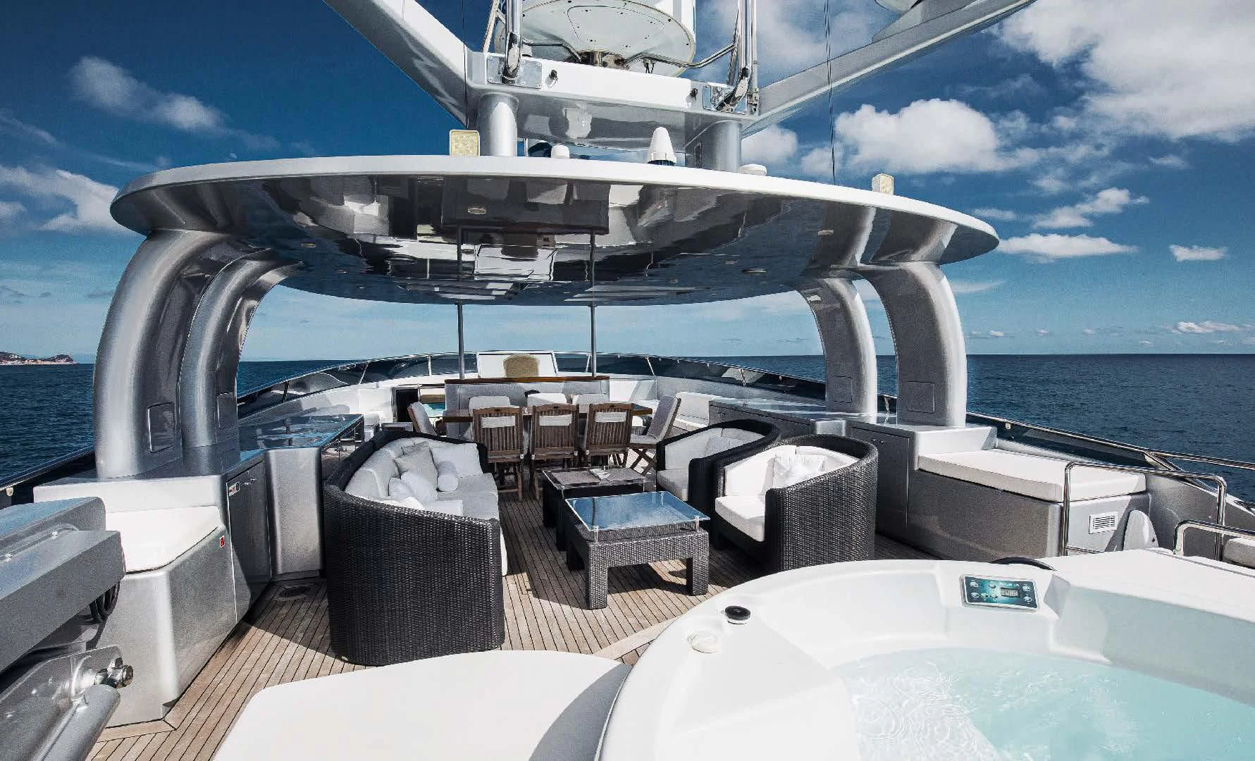 The exterior design of XO OF THE SEAS is nothing short of stunning. Her steel hull and superstructure exude strength and resilience while maintaining an aura of sleek gracefulness. The yacht's beam measures at 24 feet 9 inches (7.6 meters), providing generous outdoor spaces for relaxation and entertainment under the azure sky. The sun deck invites guests to unwind on plush loungers or soak in the Jacuzzi's soothing bubbles while savoring panoramic sea views. Alfresco dining areas offer delightful gastronomic experiences amidst refreshing ocean breezes.