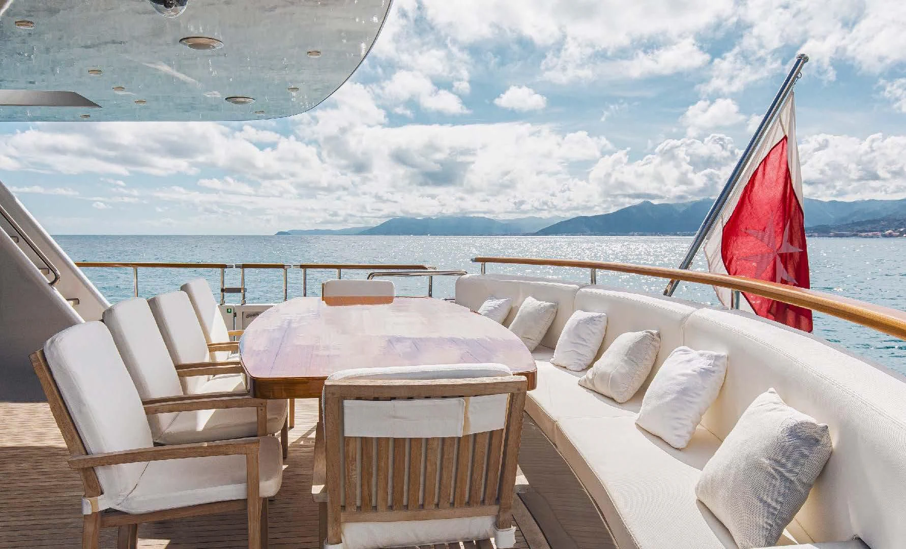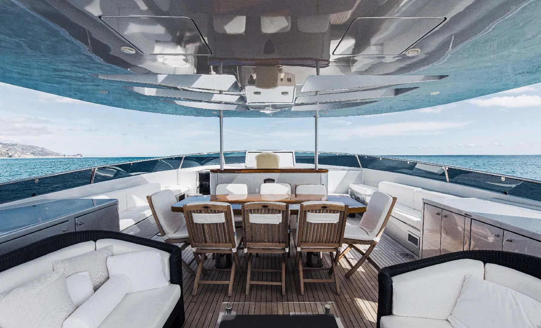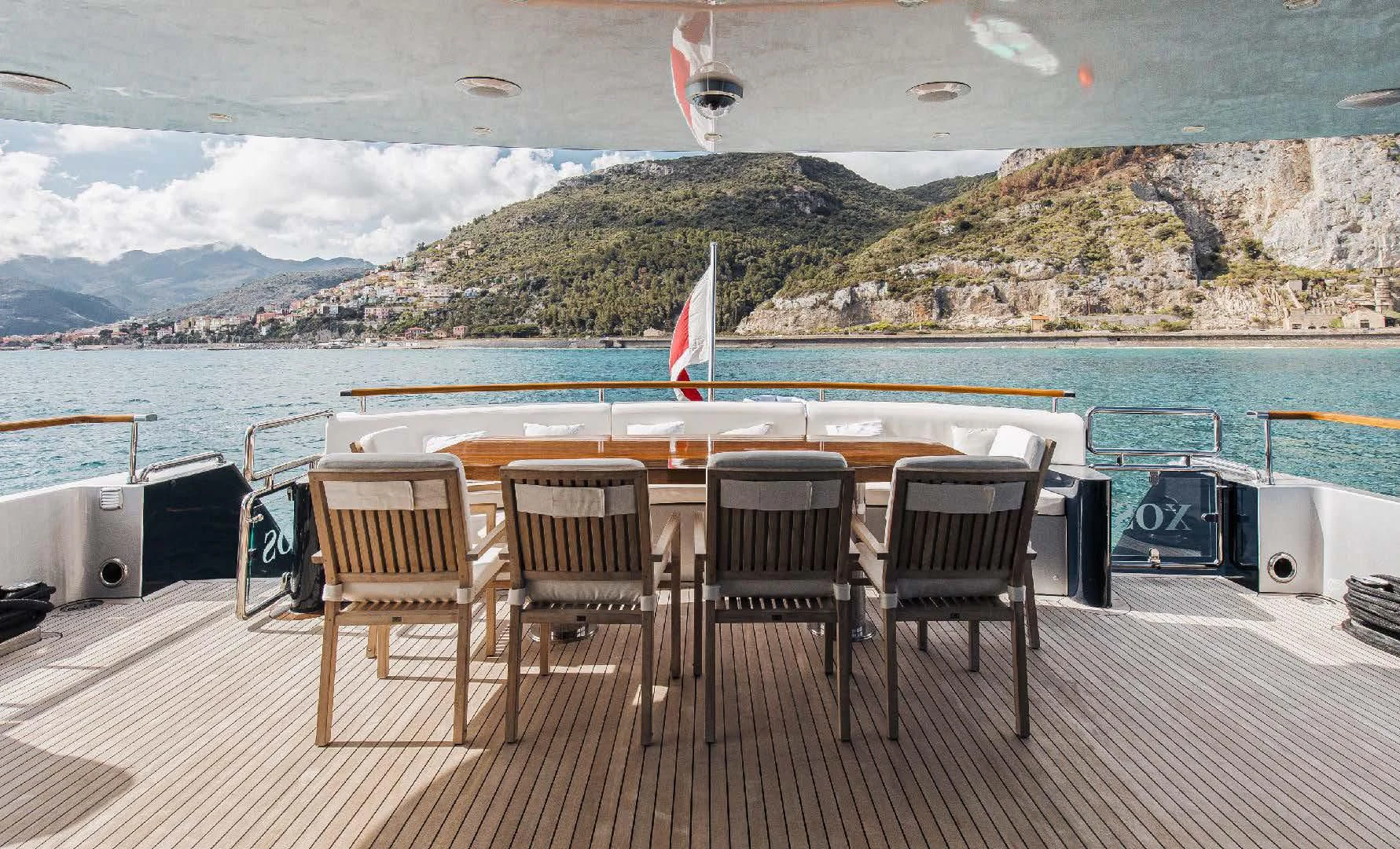 The exterior design of XO OF THE SEAS is nothing short of stunning. Her steel hull and superstructure exude strength and resilience while maintaining an aura of sleek gracefulness. The yacht's beam measures at 24 feet 9 inches (7.6 meters), providing generous outdoor spaces for relaxation and entertainment under the azure sky. The sun deck invites guests to unwind on plush loungers or soak in the Jacuzzi's soothing bubbles while savoring panoramic sea views. Alfresco dining areas offer delightful gastronomic experiences amidst refreshing ocean breezes.